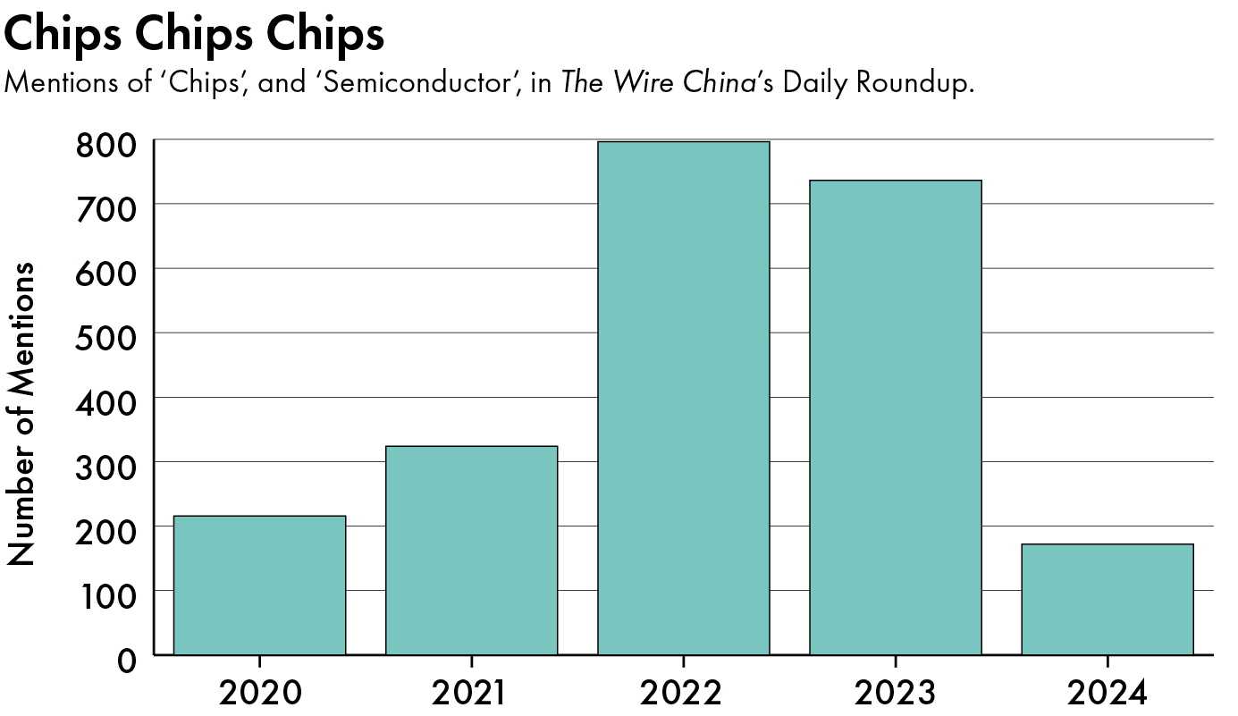 When The Wire first released the Daily Roundup in 2020, it was considerably longer than what we send out nowadays. In order to account for this change when analyzing trends over time, we normalized the data2To get to the figures you see below representing the ‘Number of Mentions’, we did the following: First, we divided the number of mentions by the total number of words in a certain time period — for example, the total number of mentions of ‘chips’ in 2021, divided by the total number of words in the Daily Roundups in 2021. Then we multiplied this by the average number of words in the Daily Roundup in 2022 and 2023, as those years best reflect the length of the morning news feed which we are sending out to this day. to present a more accurate picture of upticks and downticks.