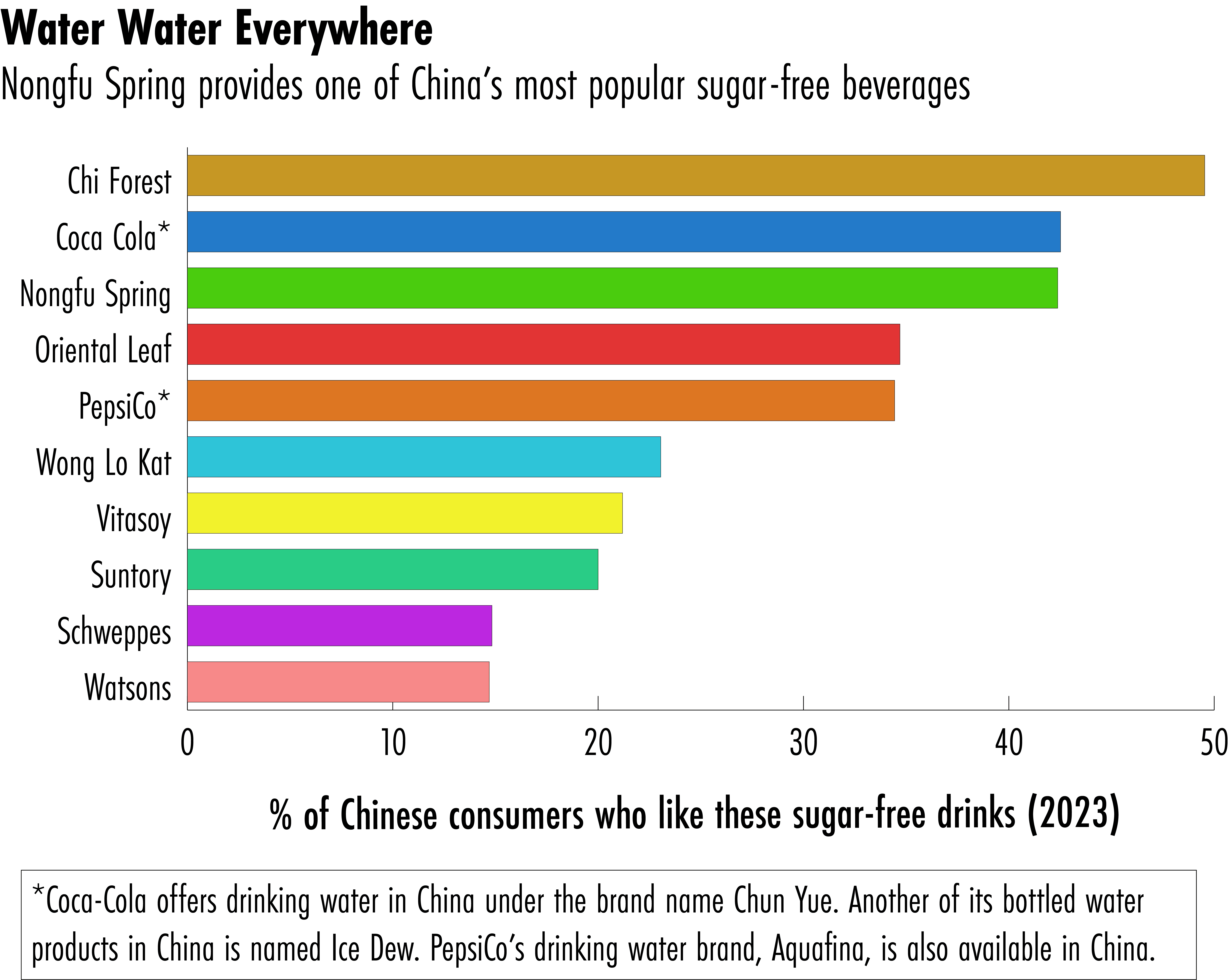 Nongfu Spring’s local competitors in China include Hangzhou Wahaha Group, Master Kong and Uni-President China, and it also competes with foreign beverage companies like Coca Cola, which offers drinking water in China under the brand name Chun Yue.