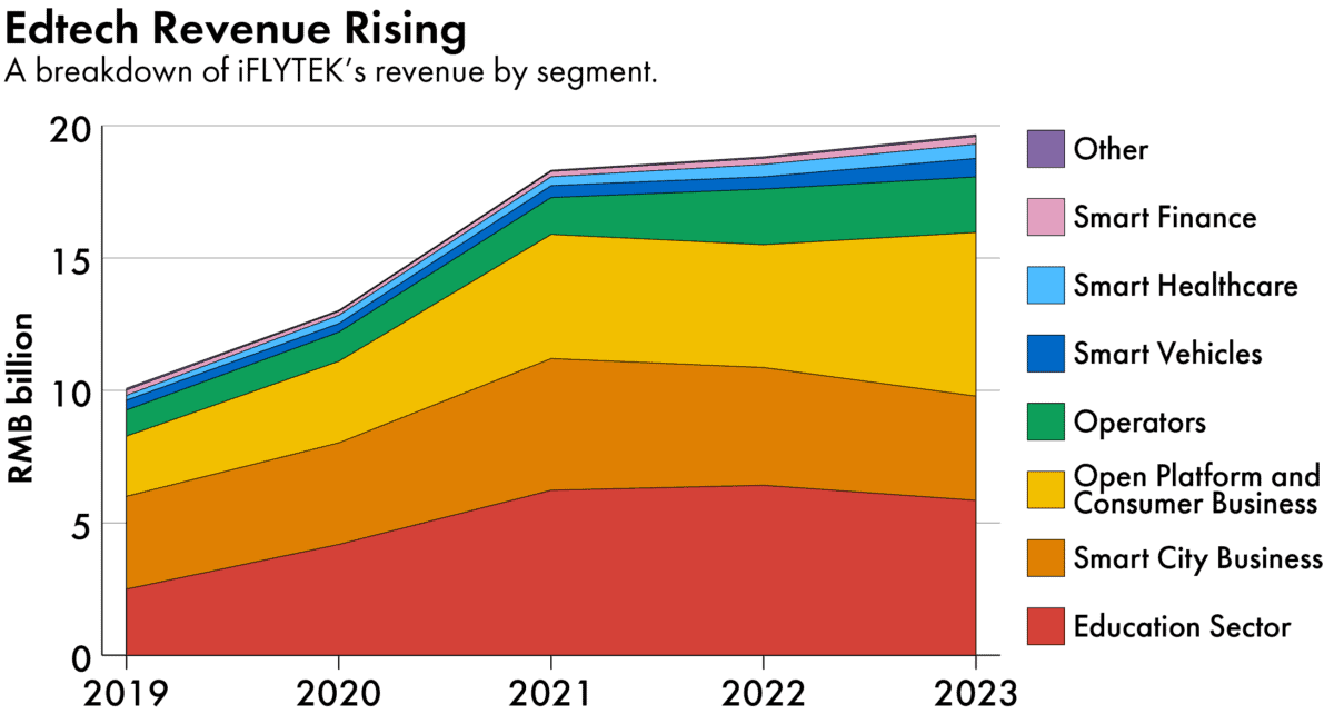 The 2019 sanctions, however, have overshadowed the fact that iFlytek has actually been in the edtech business for two decades, and it is increasingly betting on the value of AI in the classroom. In 2023, education products accounted for 30 percent of the company’s revenue, eclipsing sales from its ‘smart city’ surveillance business. iFlytek’s hi-end AI tablets now rank first in China’s domestic market share, and its AI edtech products cover 30 provinces, nearly 300 districts and counties, and serve more than 12,000 schools.