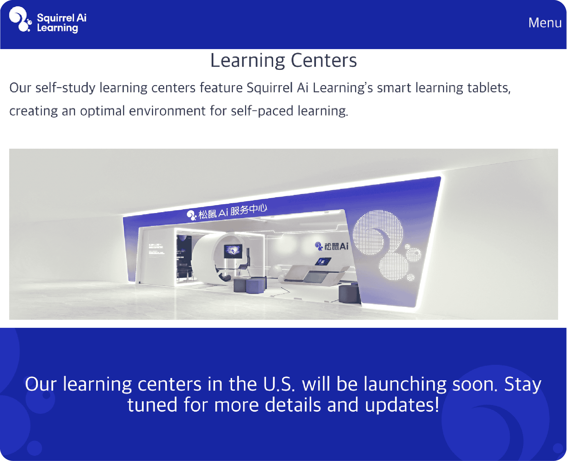 “Our primary emphasis lies on after-school programs, leveraging our successful franchise model from China. This model entails setting up offline self-study learning centers furnished with our smart learning tablets,” says Squirrel AI co-founder Liang. “Additionally, we are pursuing a strategy to bolster our presence in in-school learning environments through collaborations with prestigious educational institutions, as well as with district and public schools.”