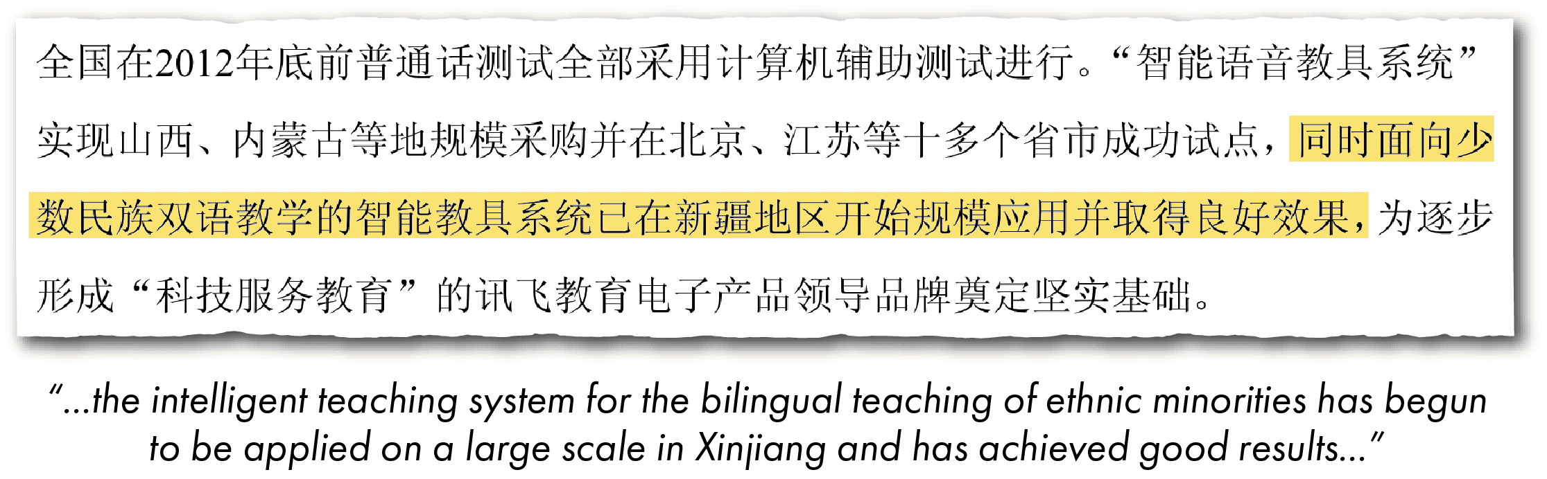 It was around this time that the company began working with education officials in Xinjiang, the semi-autonomous region that maintains Uyghur as an official language, alongside Mandarin. In 2009, iFlytek established a training lab with Xinjiang University to research “multi-ethnic speech and language core technology,” and it rolled out an “intelligence teaching aid system” for bilingual teaching at a “large scale,” according to iFlytek’s 2010 annual report.