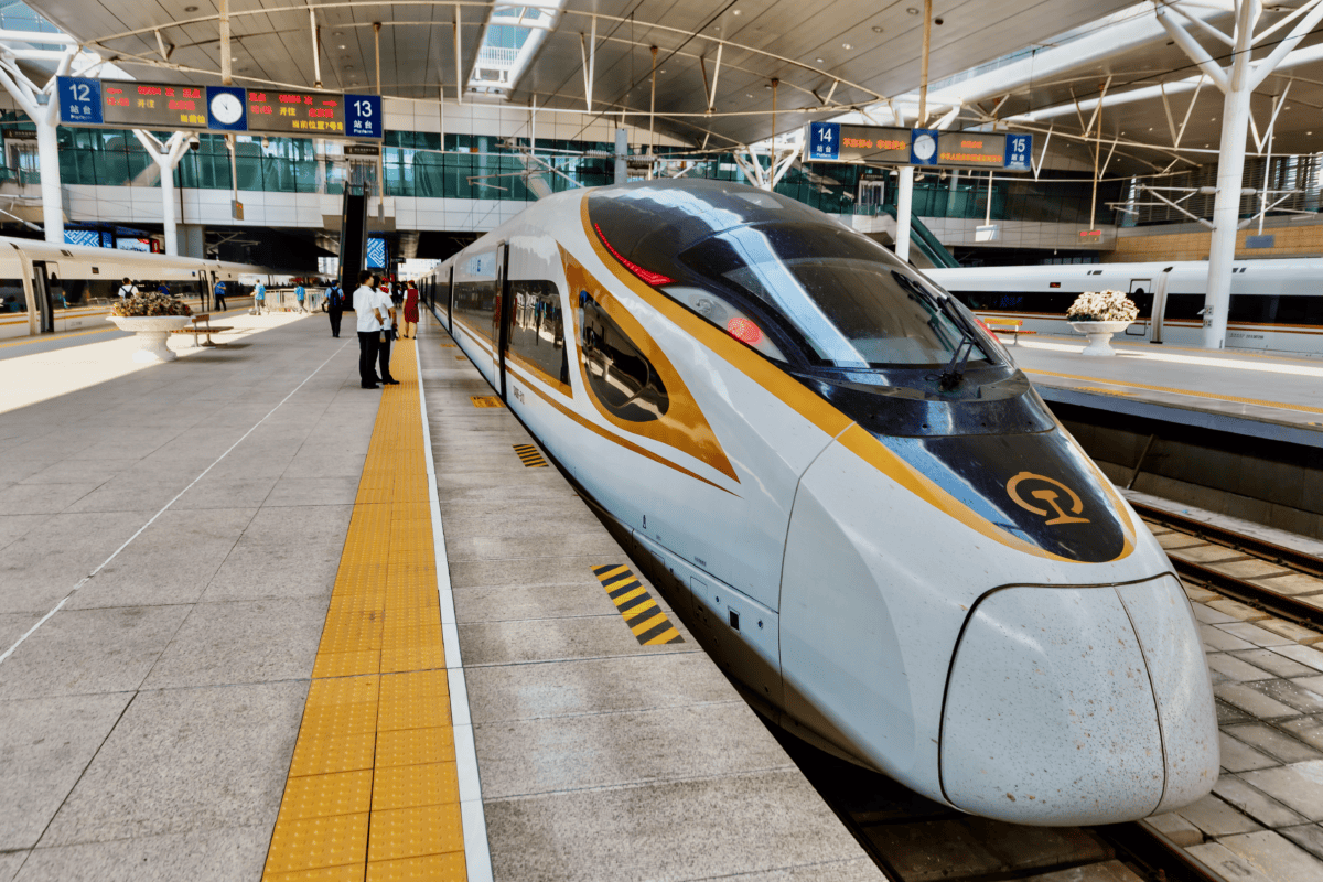Left: A NIO Power electric vehicle charging and battery replacement station in Shenzhen. Right: The Fuxing high-speed railway in Tianjin Station. Credit: Markus Mainka, Andrey via Adobe Stock