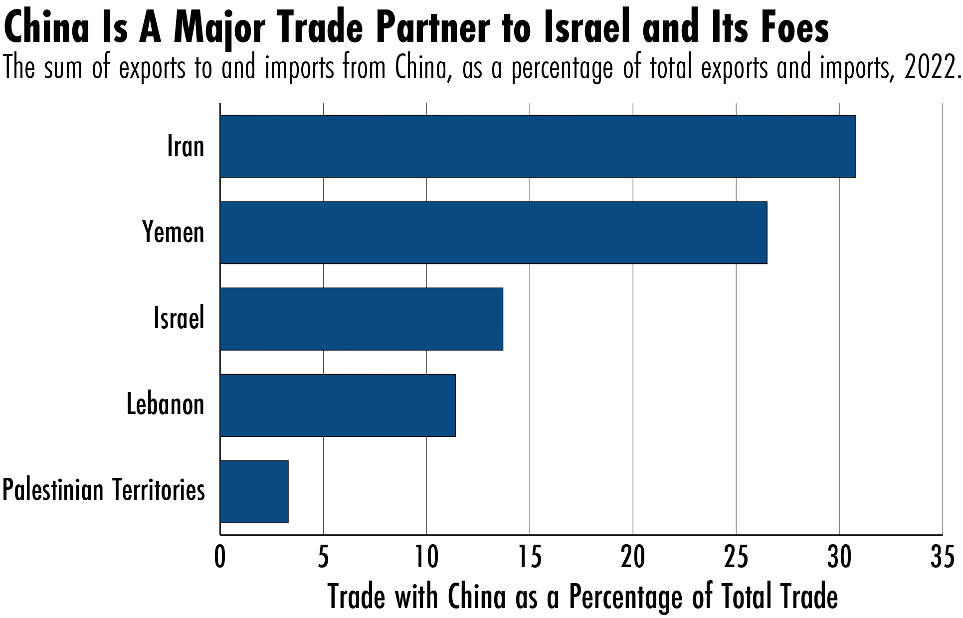 Those interests are fundamentally economic, says Jonathan Fulton, a nonresident senior fellow at the Atlantic Council who specializes in Chinese policy toward the Middle East. China is a top trading partner for all of the parties to the current conflict, including Israel, Iran, Lebanon, the Palestinian territories, and Yemen.
