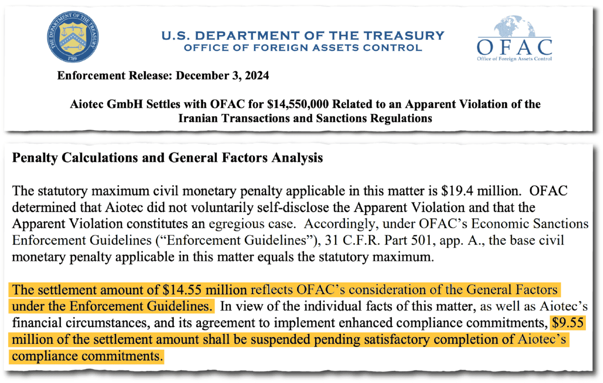 Historically, penalties for violating OFAC sanctions have ranged from the thousands of dollars to to the hundreds of millions. Last month, the German firm Aiotec GmbH settled with OFAC on a $14.6 million fine for alleged violations of U.S. sanctions on Iran.