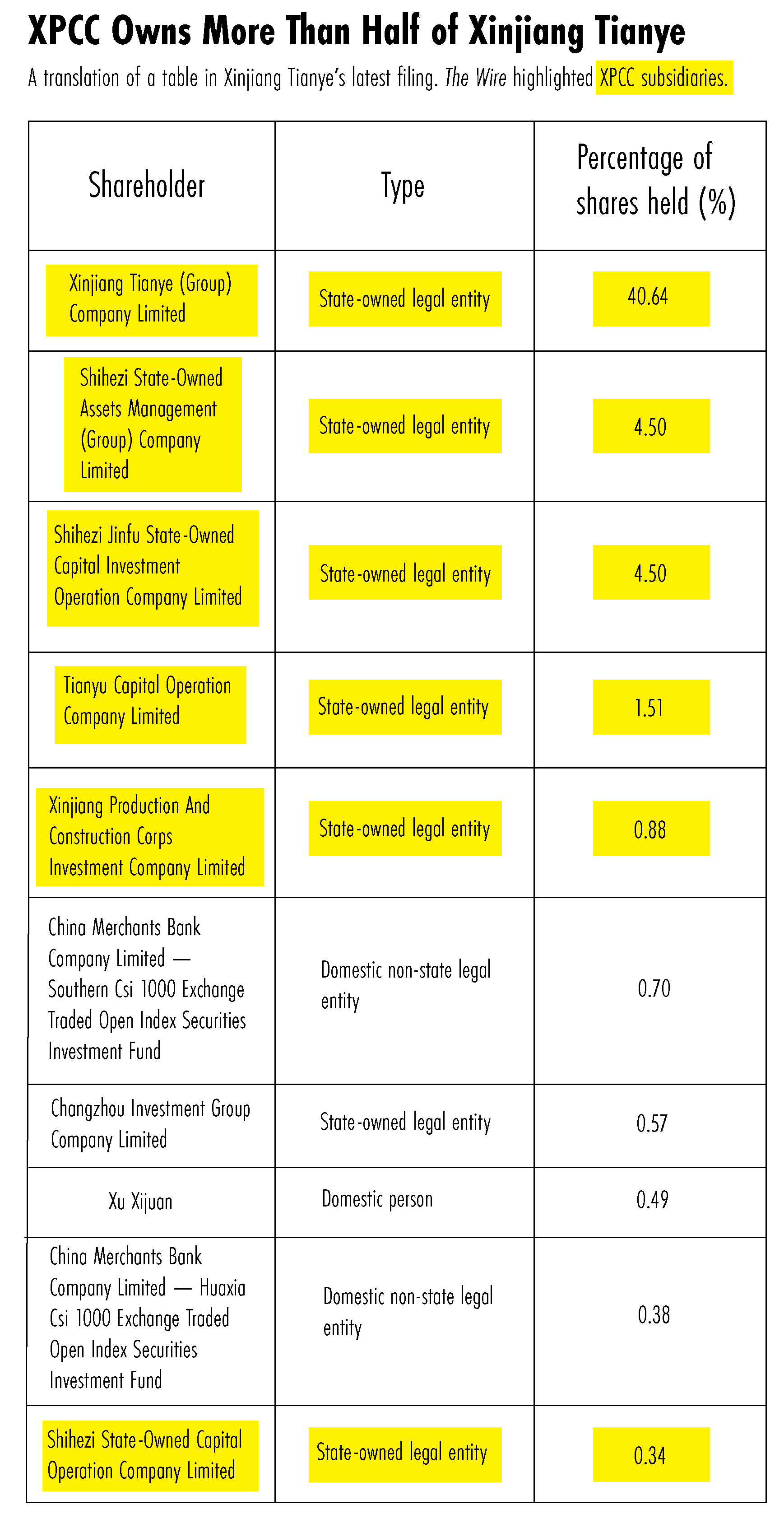 In 2021, 2022, and 2023, according to annual reports and WireScreen, entities that are now beneficially owned by XPCC combined to hold more than half of Xinjiang Tianye. (WireScreen calculated beneficial ownership through filings with state agencies, exchanges and company statements.)