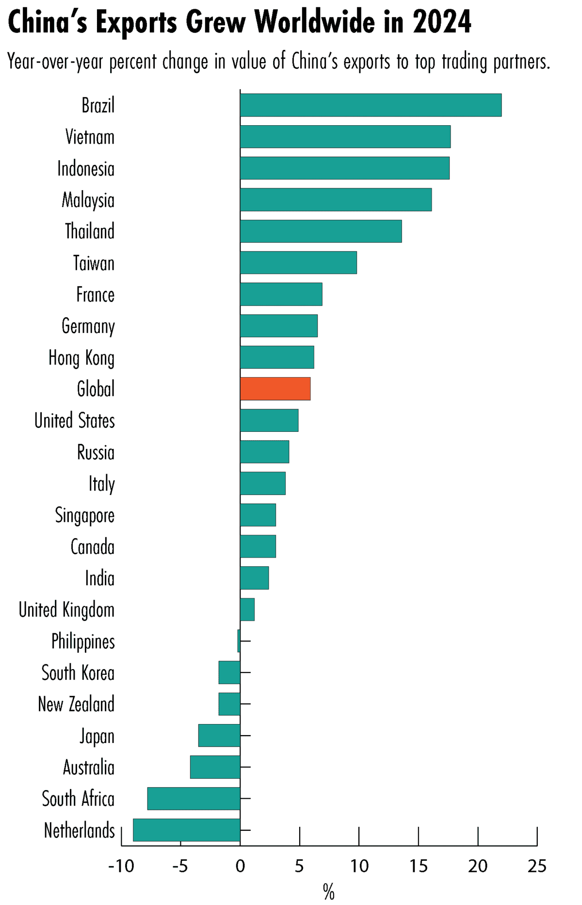 A deeper dive into the data does show shifting trade patterns, however. For example, China’s exports to Southeast Asia, where there are few market barriers for Chinese firms and strong consumer demand for cheap imports grew 12 percent. Meanwhile, only a handful of countries imported less from China in 2024 than the year prior.