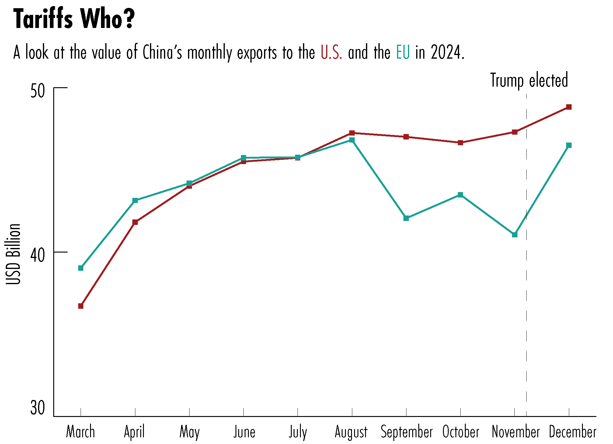 Many economists have suggested that Chinese exporters are ramping up shipments ahead of President-elect Donald Trump’s return to the White House. But these concerns are not overtly apparent in Chinese trade data. Monthly exports to the United States rose around 5 percent between October and December, but those to the EU, where there is no immediate tariff impetus to boost trade, rose by even more — nominally and proportionally.