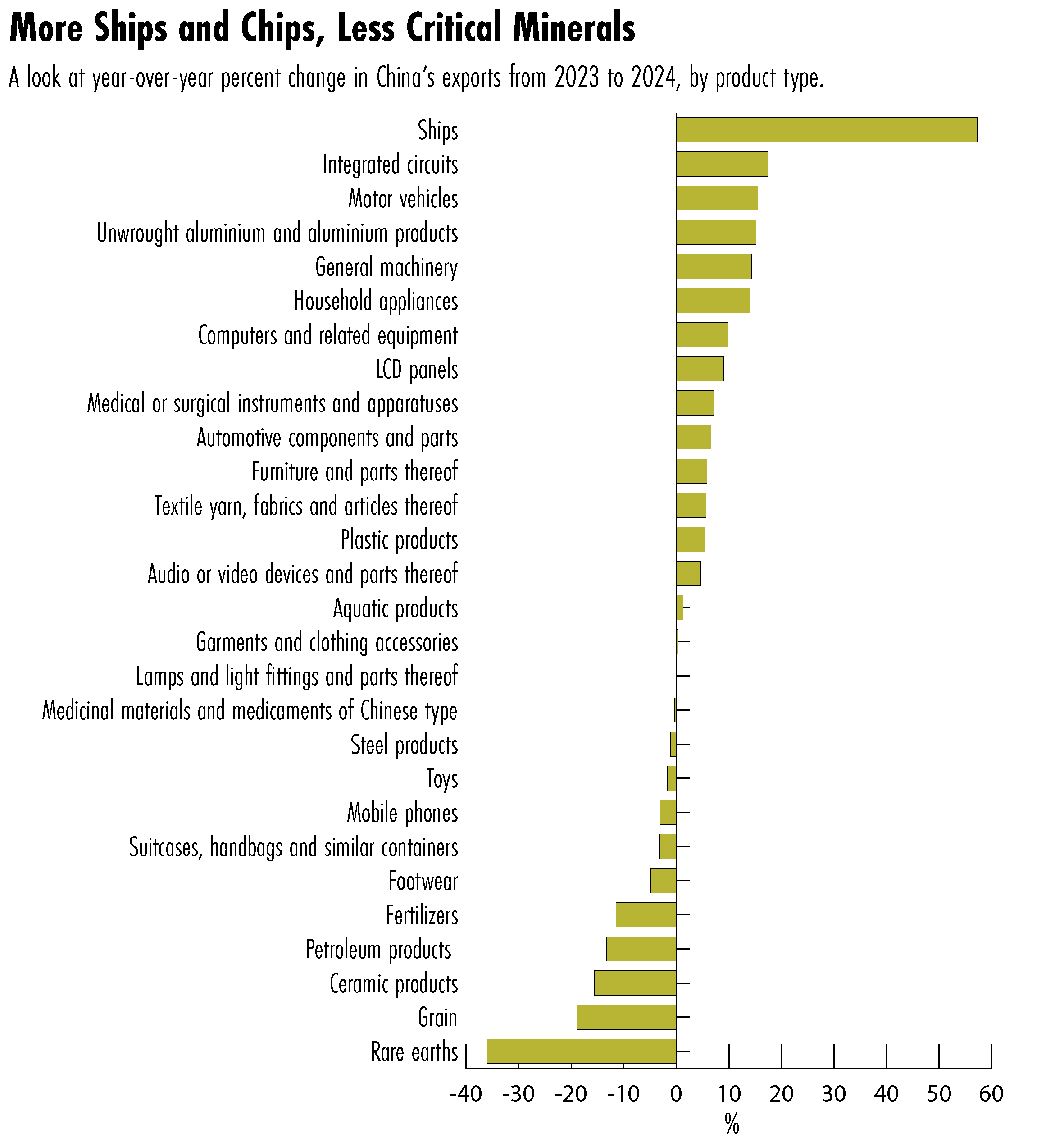 Indeed, it is exports of these high-value-added products that are growing fastest. The value of the country’s integrated circuit (also known as microchip) sales overseas rose 17 percent last year, and the value of car exports rose 16 percent. Meanwhile, exports of rare earths fell significantly as China consolidated control over the global battery supply chain.
