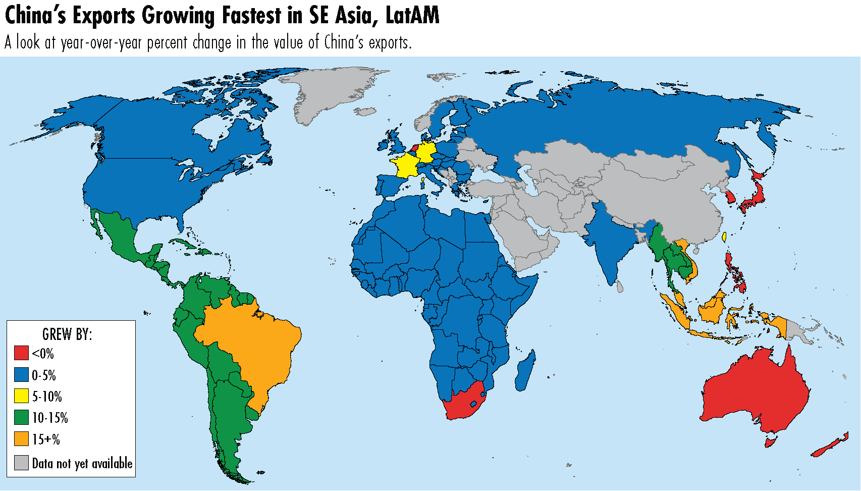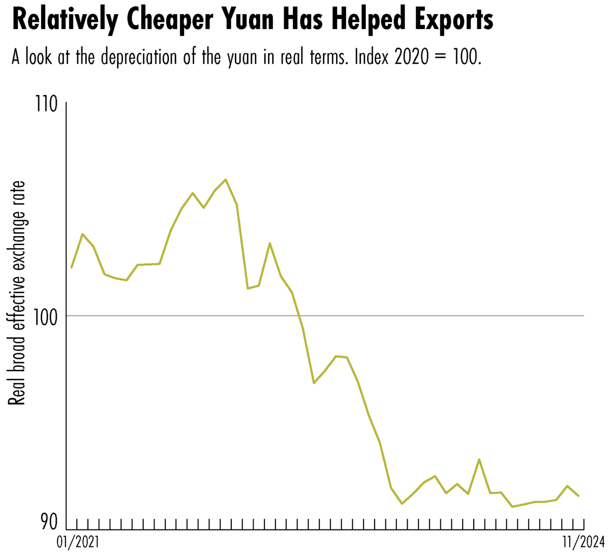 It’s not just new markets that have invigorated China’s exports. China’s sales abroad have been aided by a depreciating yuan, which has fallen in real terms against its trading partners’ currencies due to China’s low inflation rate. That makes exports cheaper.