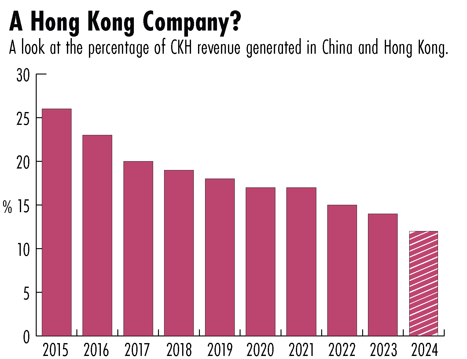 What is clear is that CK Hutchison has looked to diversify away from Hong Kong in recent years. In 2018, for example, the company fully acquired telecom operators in Italy and Sri Lanka. China and Hong Kong made up just 12 percent of the company’s revenue during the first six months of 2024, according to its most recent interim report, less than half the share a decade ago.