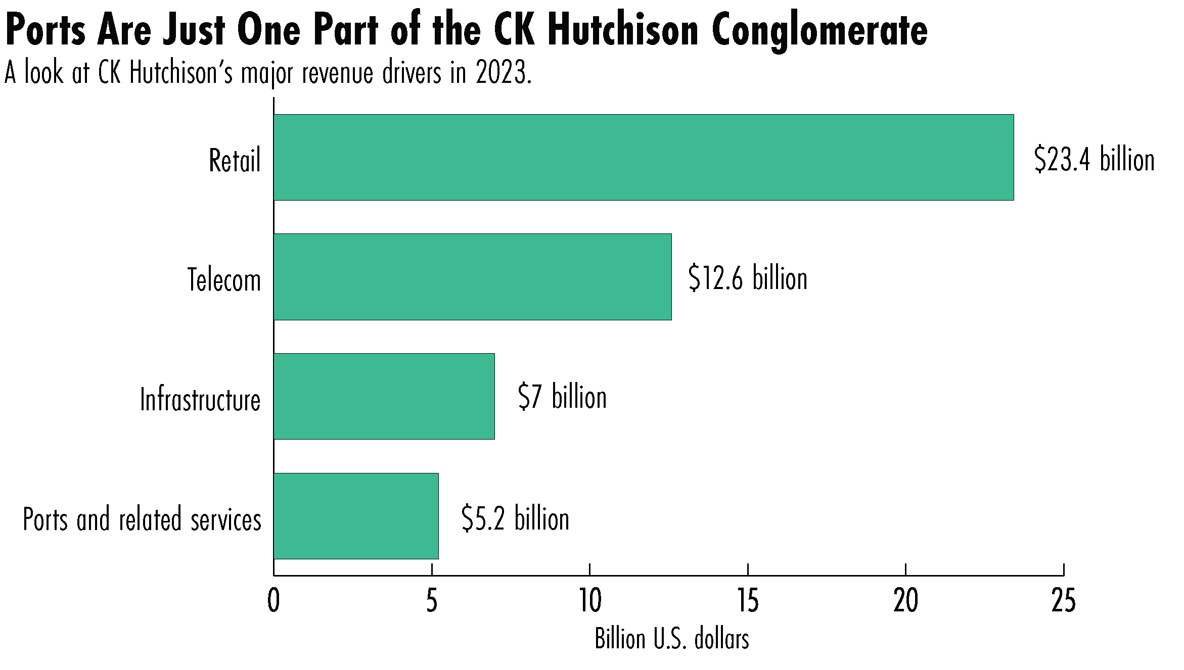 Listed in Hong Kong and registered in the Cayman Islands, it currently has a market value of around $19 billion, turning a net profit in 2023 of around $3 billion. The company’s retail business, primarily made up of health and beauty stores like the British pharmacy Superdrug and the Asian chain Watson’s, is its biggest revenue generator. Its ports business makes up less than a tenth of the firm’s revenue.