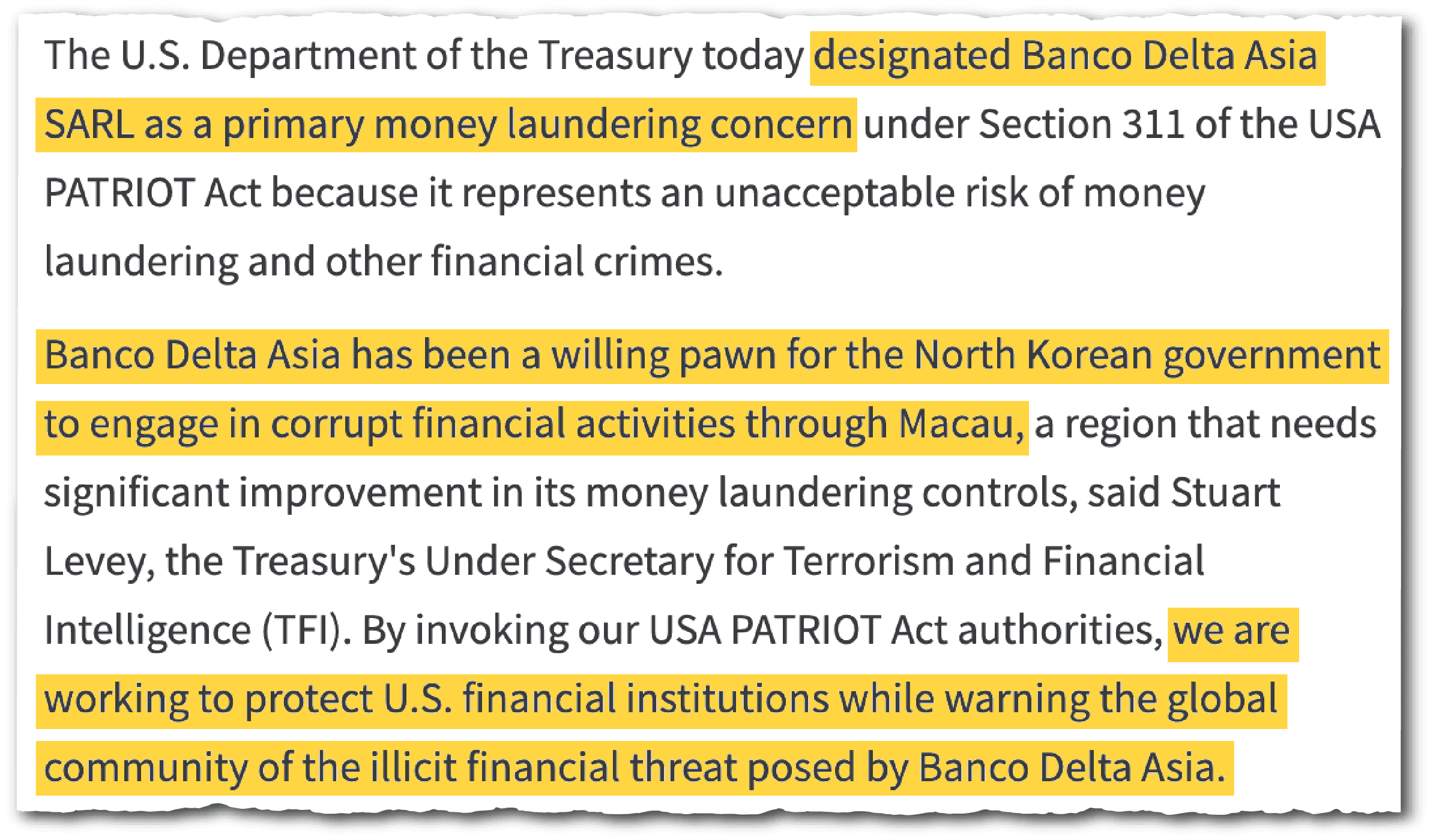 He had reason to be optimistic. Just months before, Levey had earned the respect of America’s national security establishment when Treasury designated the Macau-based Banco Delta Asia a “primary money laundering concern” for North Korea and signaled its intent to cut the bank off from the U.S. financial system sometime in the future.