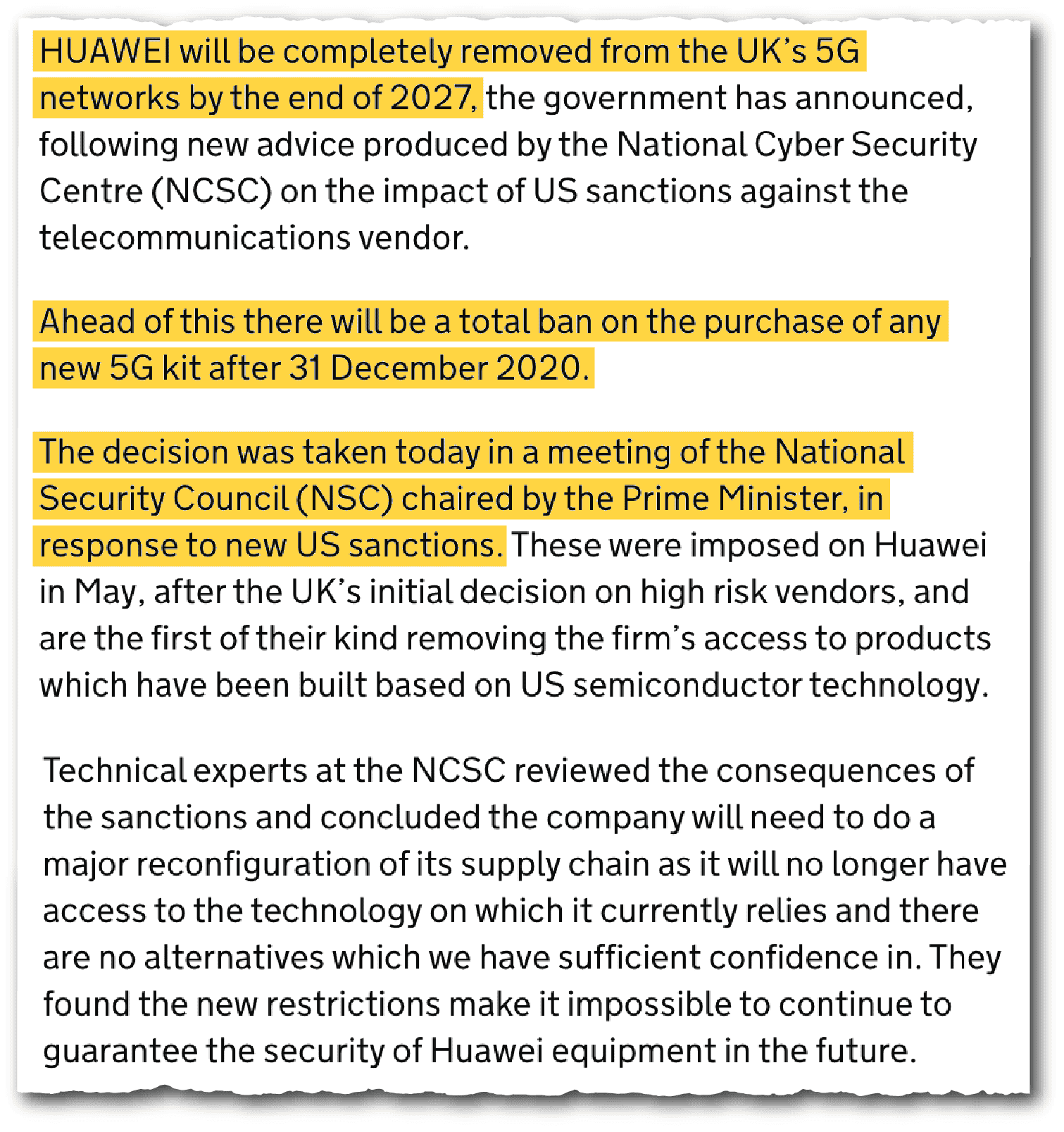 It didn’t take long for UK telecom operators to grudgingly acknowledge that the lure of Huawei’s low prices might no longer be enough. Without access to high-end chips, there was no telling how well Huawei’s products would function or whether the company could maintain its equipment over time. Before the UK even finished its emergency review, Telefónica, the parent company of Britain’s largest mobile carrier, agreed to shun Huawei.