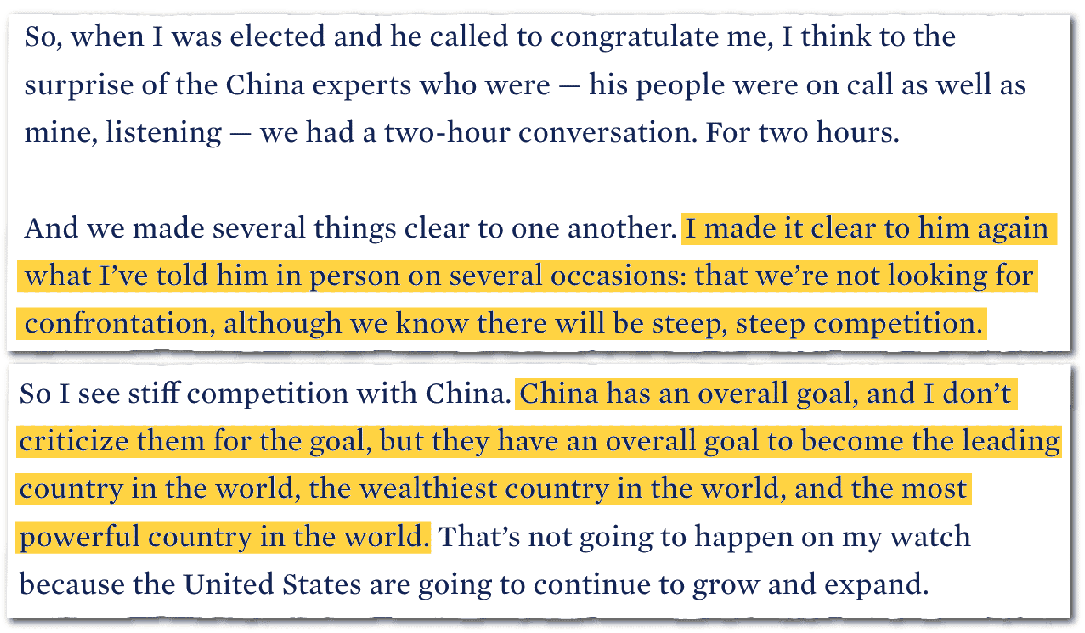 One of the interesting things about these interviews is getting to talk about things that happened in the past and why the U.S. did or didn’t do something. I would say that a fair theme from people in your administration and the Obama administration is that the U.S. should have responded more forcefully to China back in the Obama administration.