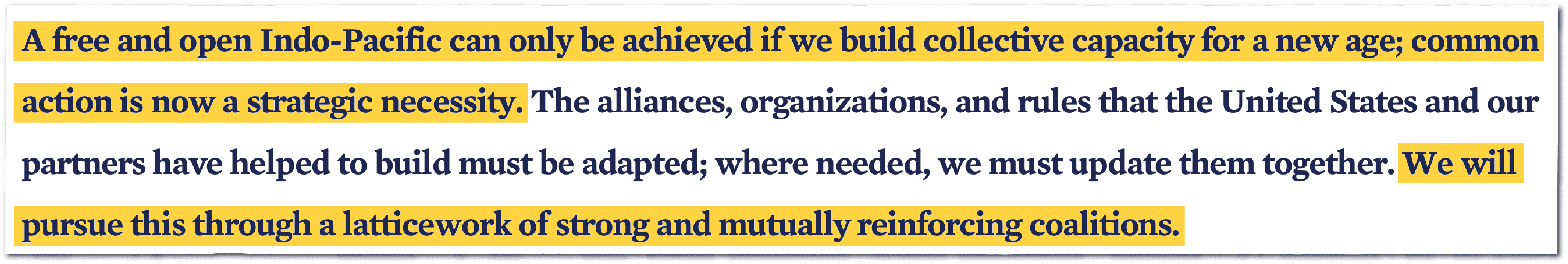 The phrase that the Biden administration used at the Pentagon, State Department and the White House was a ‘latticework,’ which I always found kind of a cumbersome phrase. The idea was that you’re networking your allies and partners together to create greater capability.