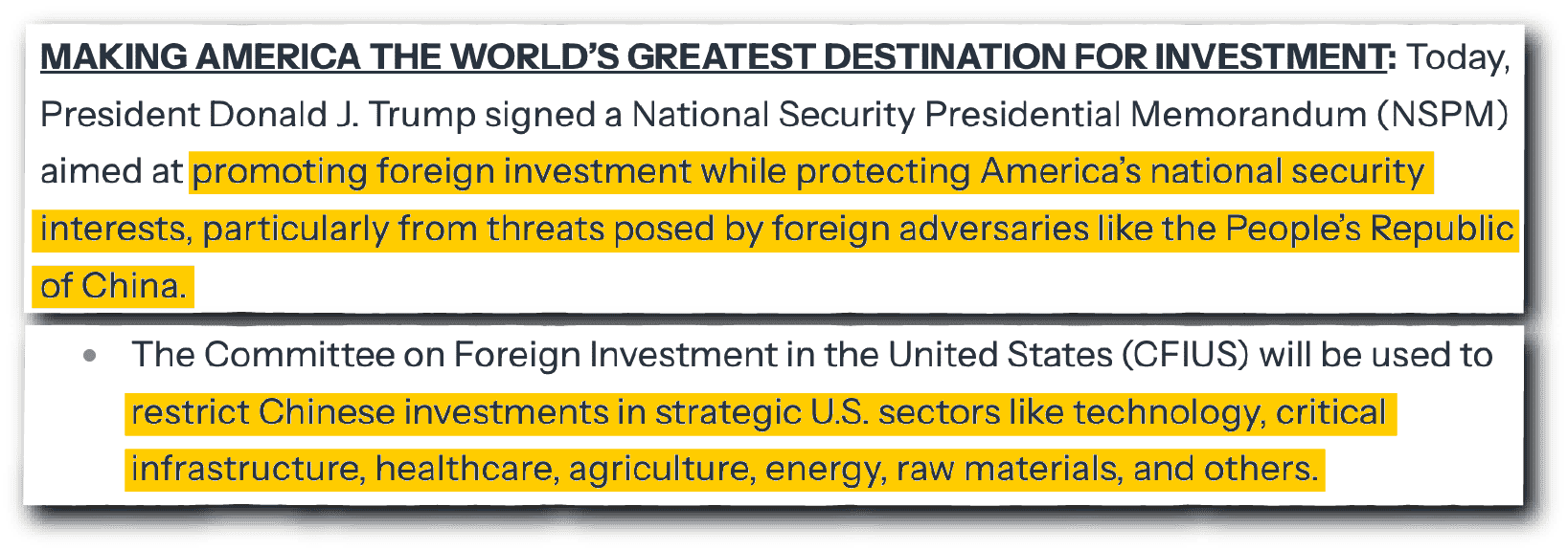 He has talked about welcoming Chinese investment into the United States during the campaign, as long as they provided U.S. jobs. But we’ve also seen moves to toughen up restrictions on Chinese investment in the U.S. and outbound investments that’s targeted against China.