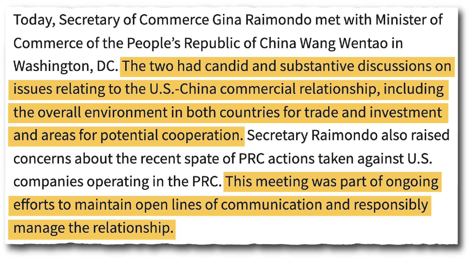 During much of your time at Commerce, relations with China were awful, with the balloon incident, the Pelosi visit to Taiwan and so on. You were involved in the Raimondo meeting with Chinese Commerce Minister Wang Wentao in trying to stabilize things. How did that go?