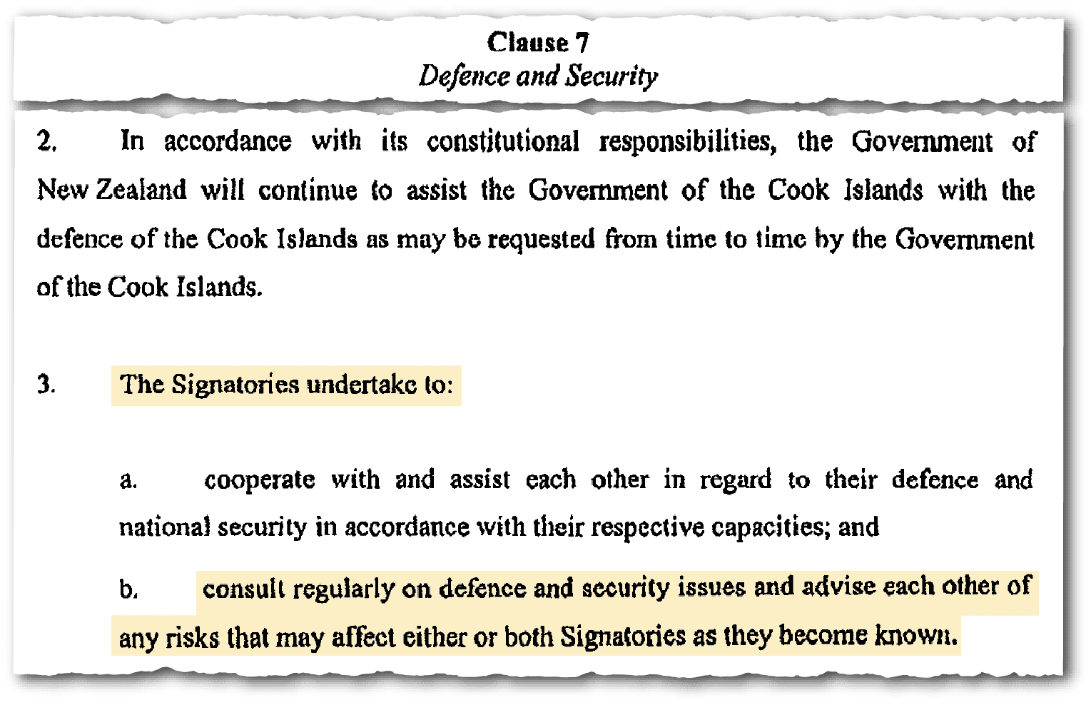 Under the terms of the free association arrangement, New Zealand “must be involved in matters of disaster, defense and foreign affairs”. A 2001 “Joint Centenary Declaration” further requires the Cook Islands and New Zealand to “consult regularly on defense and security issues”.