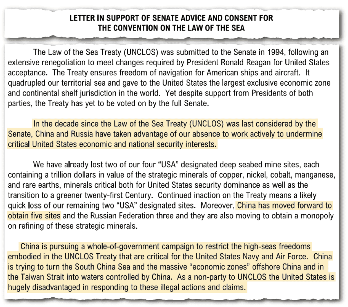 In 2024 a group of 346 U.S. politicians and military leaders, including former Secretary of State Hillary Clinton, former Defense Secretary Chuck Hagel and former National Intelligence Director John Negroponte signed an open letter claiming that China had “taken advantage of our absence [at the ISA] to undermine critical U.S. economic and national security interests”.