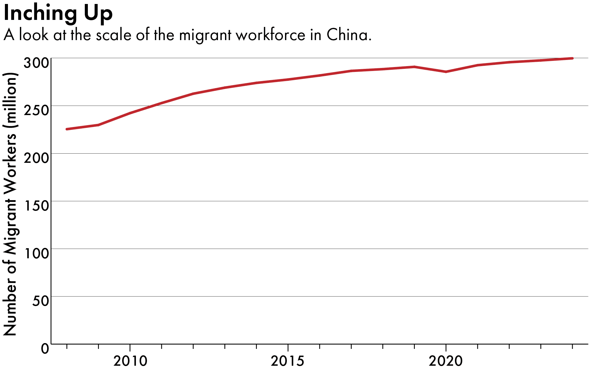 There are nearly 300 million migrant workers in China — labourers with rural hukou under the household registration system who work outside the agricultural sector — according to official data recently released by the National Bureau of Statistics. That’s up by 9 percent since a decade ago, with migrants now accounting for 41 percent of the country’s total workforce.