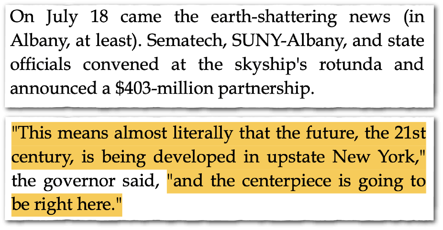 Two years later, Pataki would boast that this vision was being realised: “The 21st century is being developed in upstate New York,” he said at Albany Nanotech.