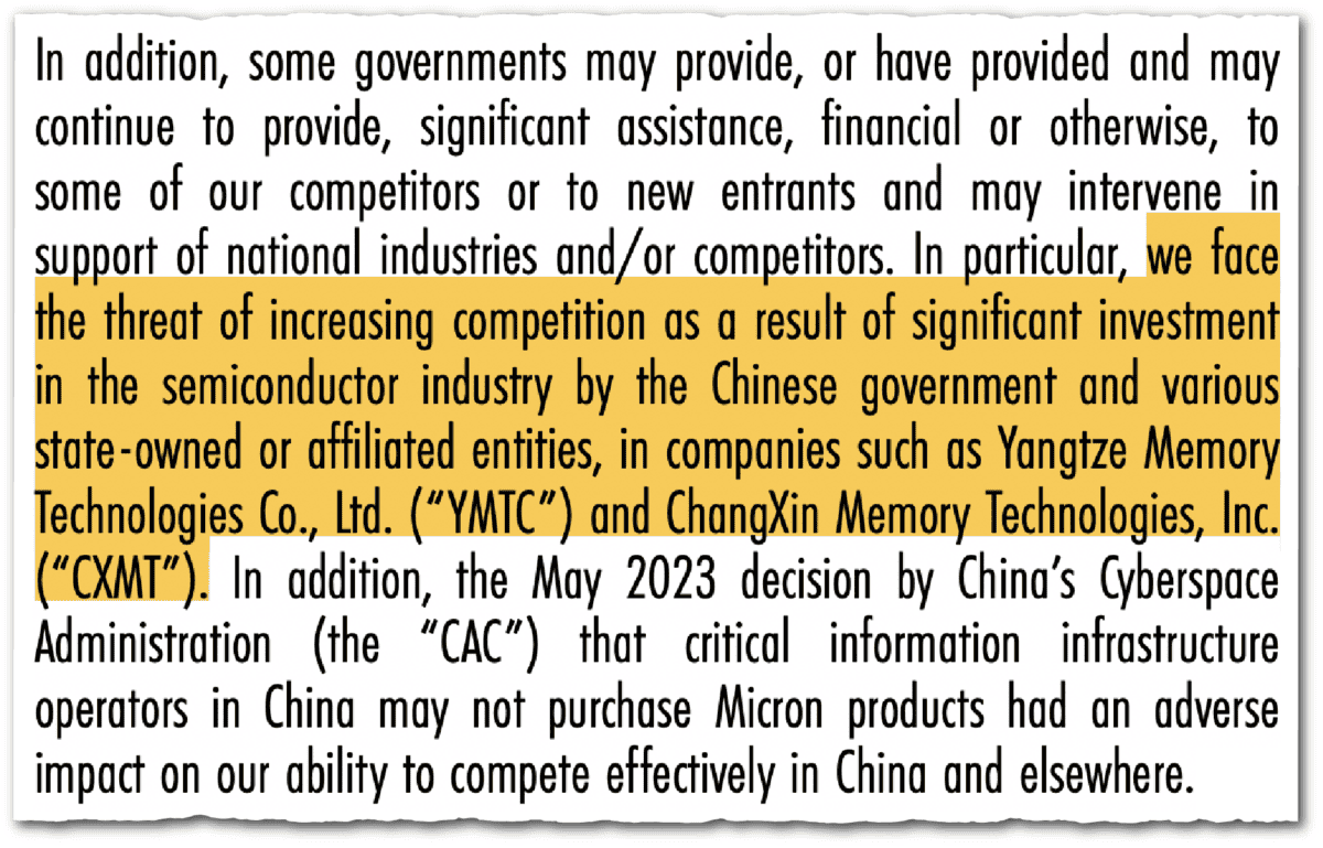 As in many high-tech arenas, the growth of the two Chinese memory chipmakers is the product of state support. In its most recent annual report, Micron warned that it faces “the threat of increasing competition as a result of significant investment in the semiconductor industry by the Chinese government and various state-owned or affiliated entities” in companies like YMTC and CXMT.