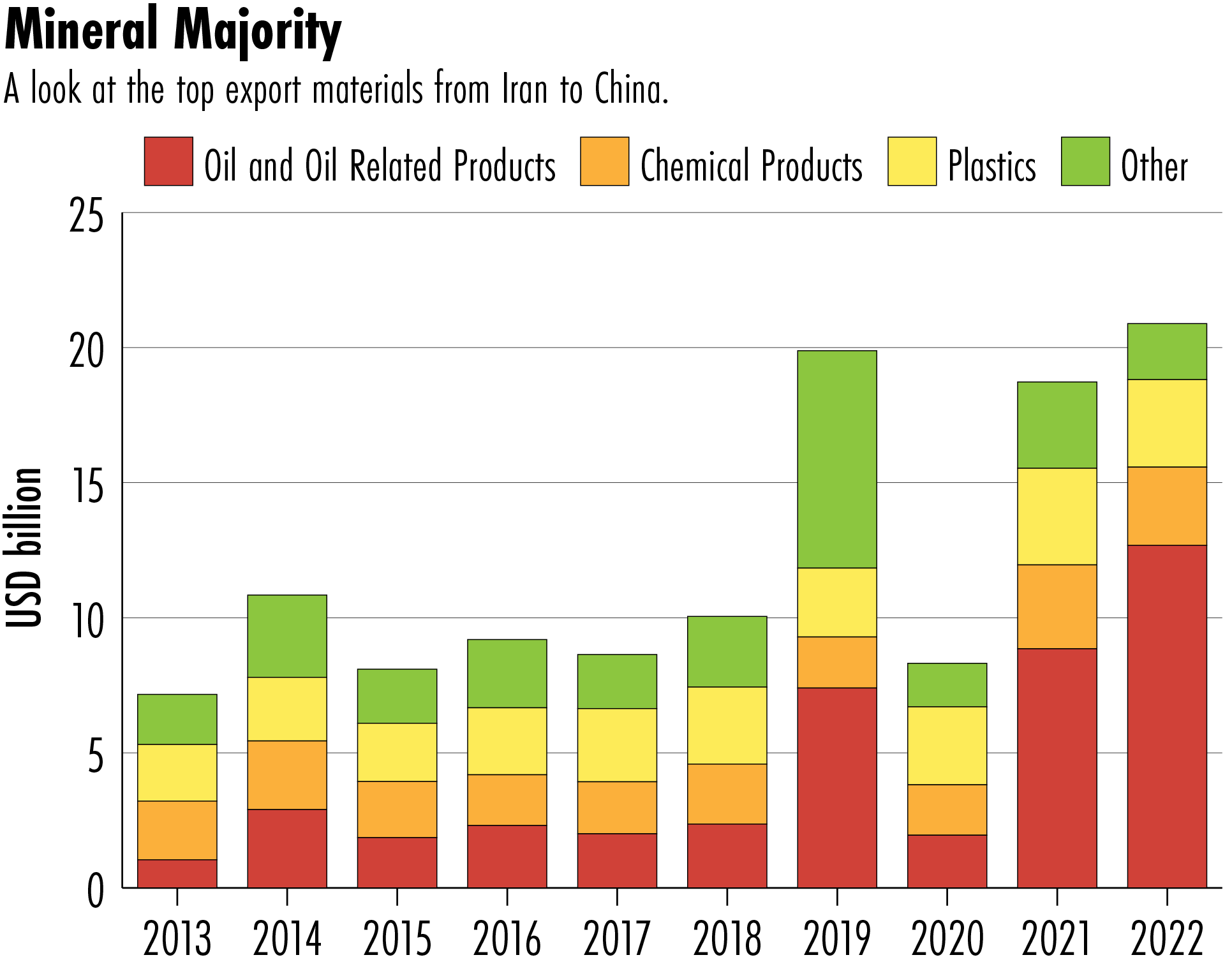 China and Iran’s economic ties have grown closer in recent years, particularly since the two countries signed a 25-year comprehensive cooperation plan in 2021 — China is now Iran’s top trading partner, according to the Observatory of Economic Complexity, which monitors global commerce. Total China-Iran trade nearly doubled from 2020 to 2022, and has consistently accounted for around 30 percent of Iran’s global trade since 2019.
