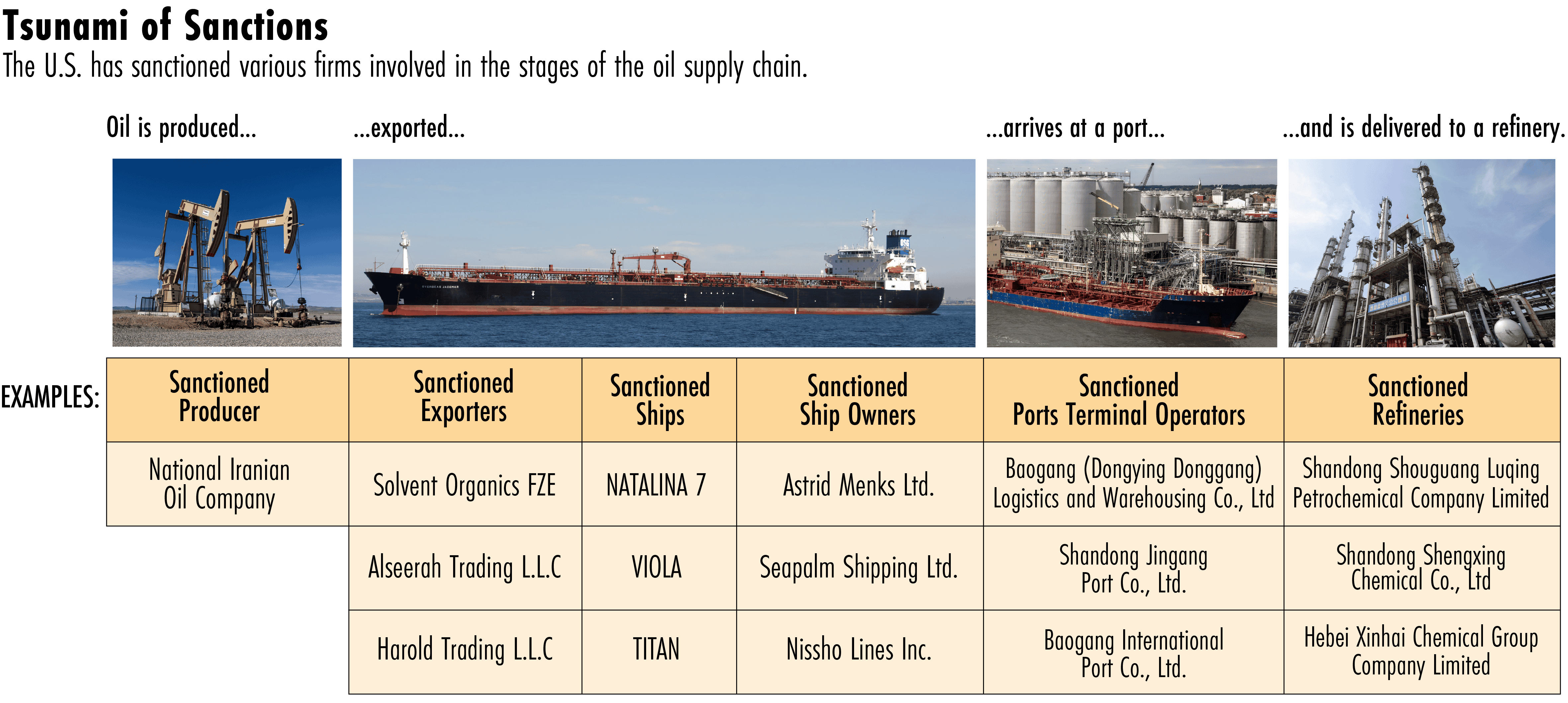 The sanctions target every link of the supply chain that supports the teapots’ operations, from the major Iranian oil producers and regional exporters in Iran and the UAE, to the vessels transporting the crude and their owners, to Chinese port terminal operators, and finally the Chinese refineries themselves.