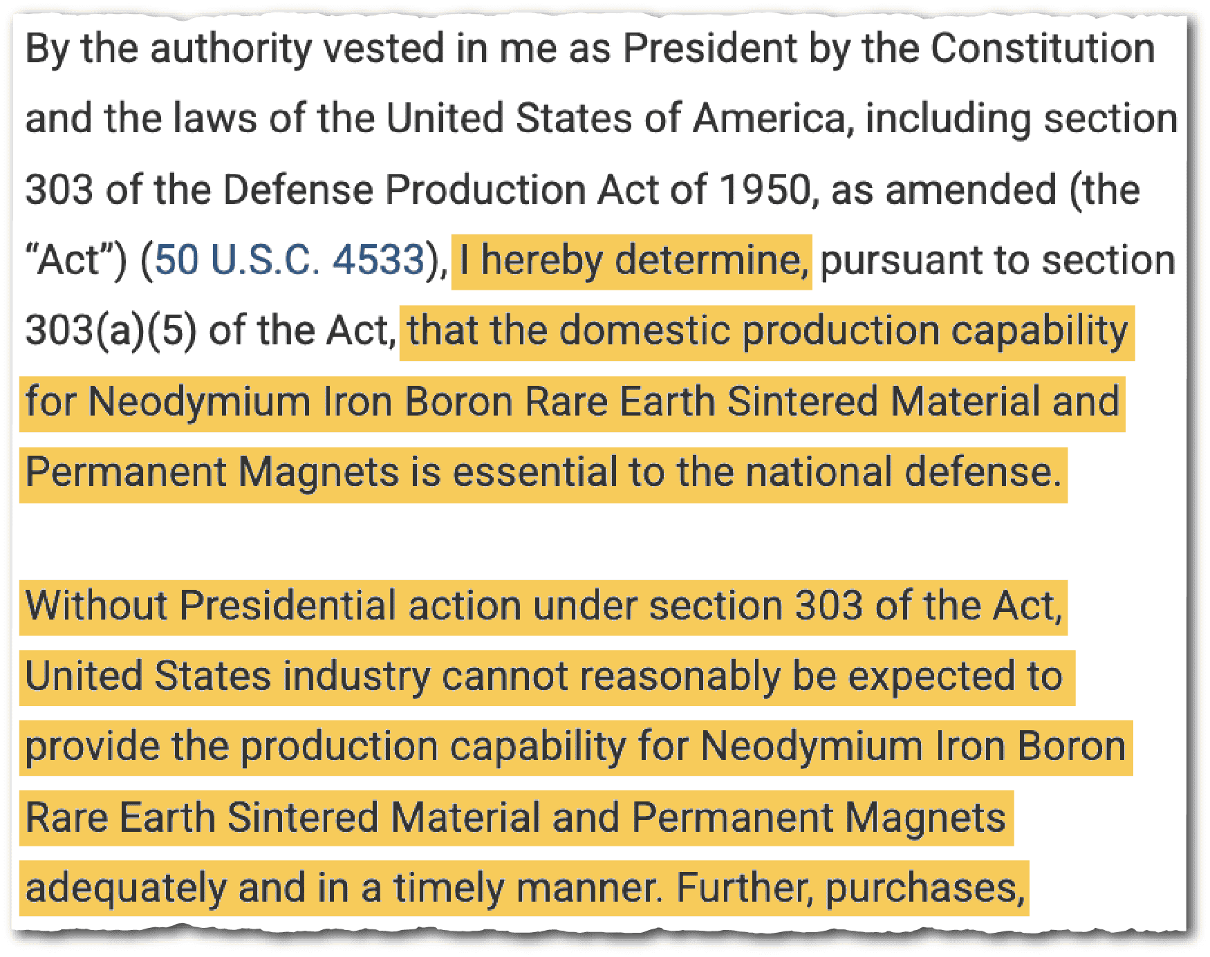 Experts credit President Trump for, during his first term, issuing executive orders and developing new strategies to build a domestic supply chain for rare earth minerals. In 2019, for example, Trump issued presidential determinations under the Defense Production Act allocating $250 million to develop a U.S. permanent magnet supply chain.