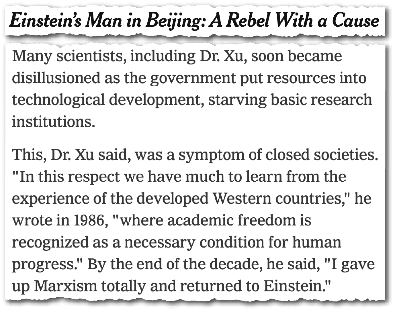 As an adolescent, Xu absorbed Einstein’s scientific writings through his father, which led him to pursue science and engineering. On his own, he devoured mathematics and physics textbooks and assembled radios and other electronics. Through secretly channelled VOA broadcasts, he taught himself English. Only much later in his late twenties, while being persecuted himself, did Xu, like his father, also absorb Einstein’s liberal politics.