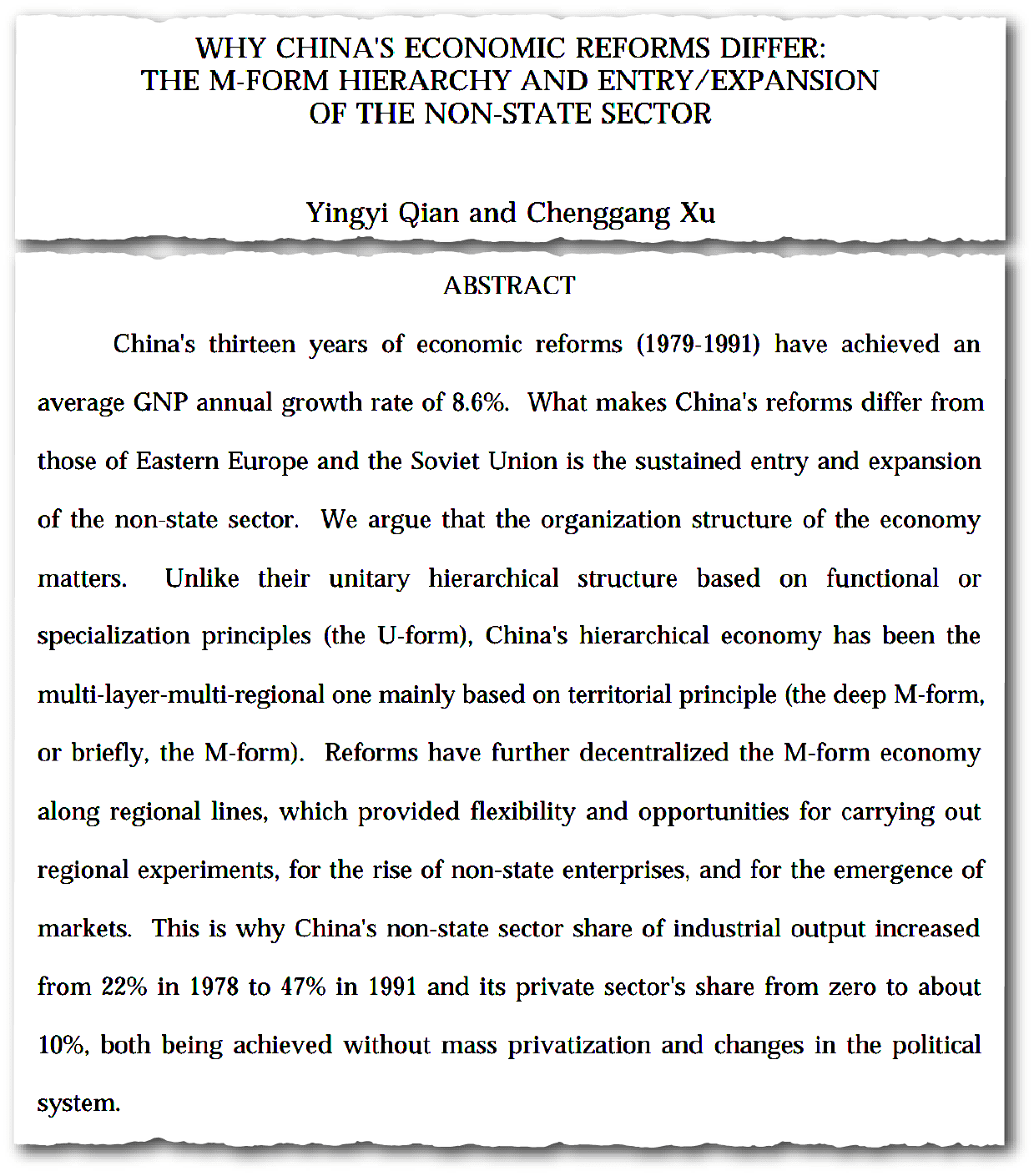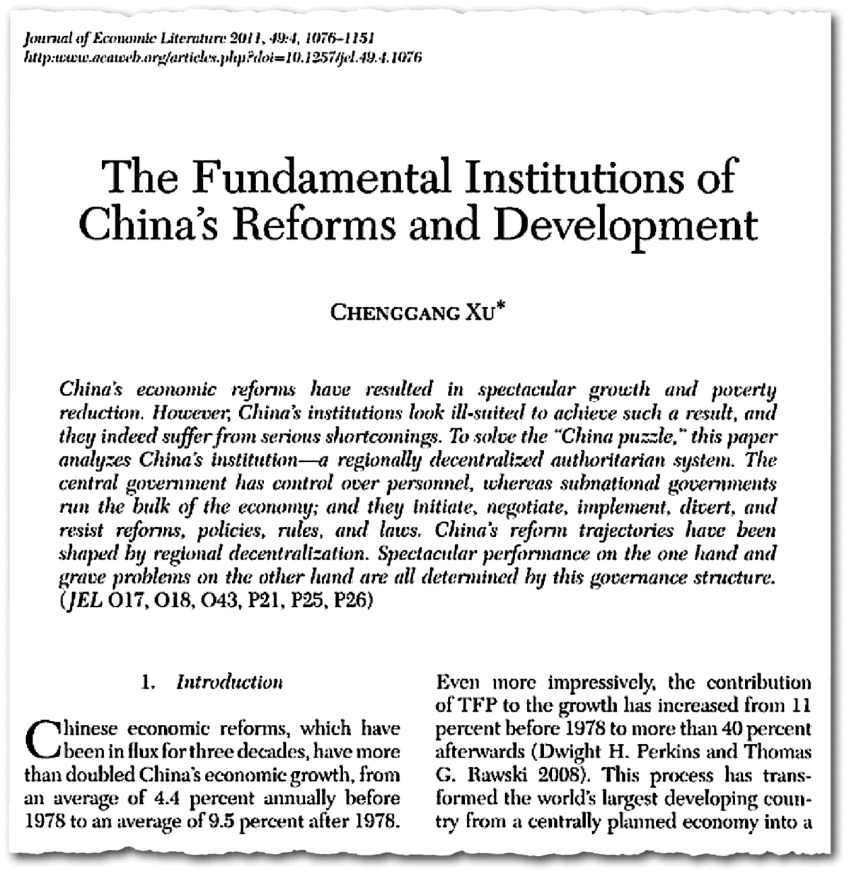 The paper argued that China’s success was mainly due to the fact that economic authority there was dispersed across provinces and localities, with a wide range of autonomy granted to local governments. This diffusion encouraged economic competition. It is a concept which Xu now calls “regionally administered totalitarianism”.
