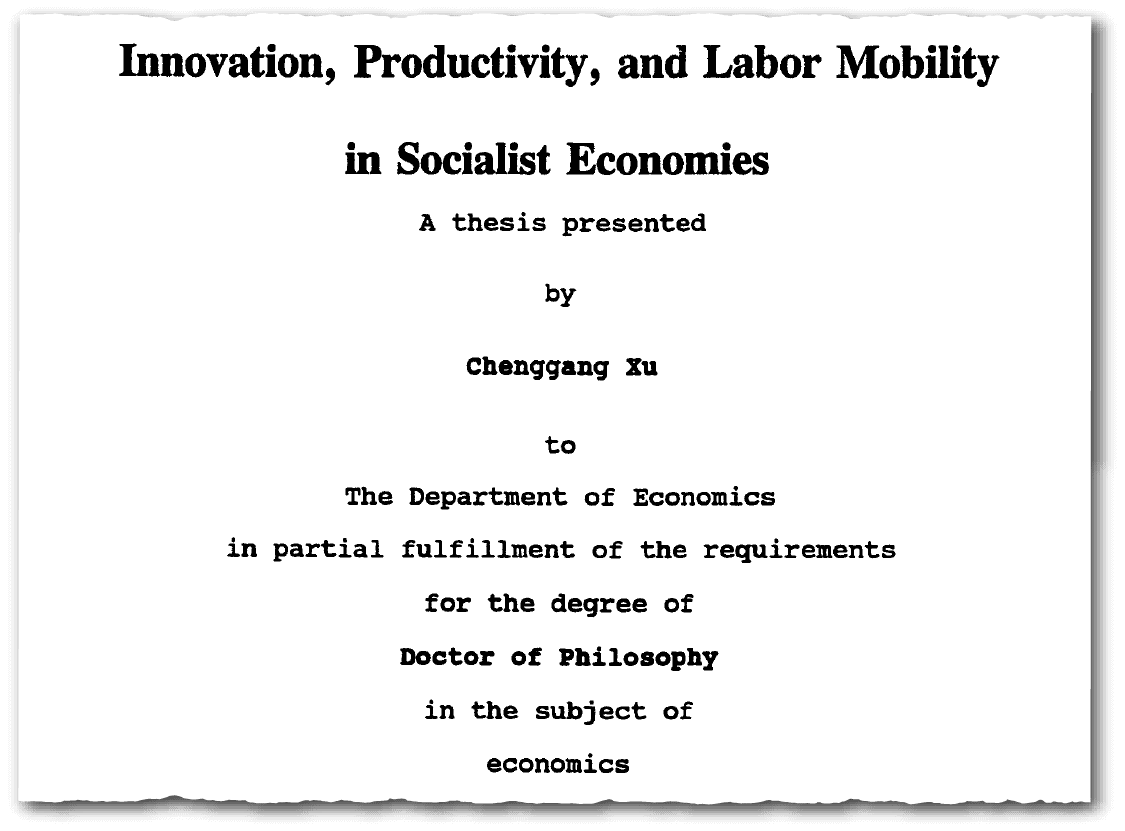 Economists wondered how Chinese communism could achieve such impressive economic growth while other communist countries had failed. Xu, the disillusioned Marxist, went about solving that mystery with a near-obsessive intensity. Working under Maskin and the late Hungarian economist János Kornai, Xu completed his dissertation in 1991. It was a collection of papers looking at China from a theoretical lens entitled “Innovation, productivity and labor mobility in socialist economies.”