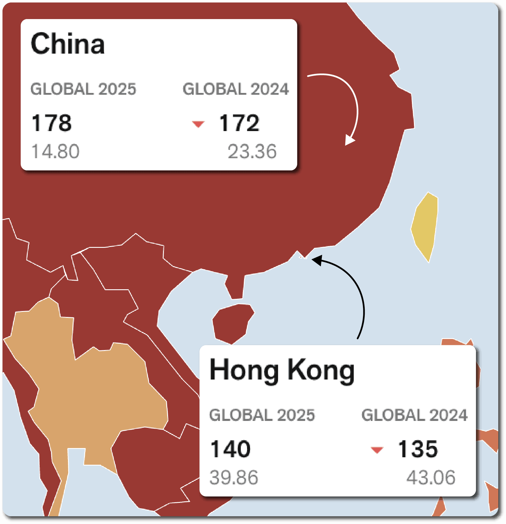 The 2025 index of world press freedom published by Reporters Without Borders says journalists are under severe threat in Hong Kong. Self-censorship is now pervasive in a territory that once ranked among the freest in the world. Press freedom has fallen precipitously and is near the bottom in the latest RWB ranking, to 140 out of 180 territories surveyed. By contrast in 2002 Hong Kong was ranked as the fourteenth most free. China in 2025 is ranked 178.