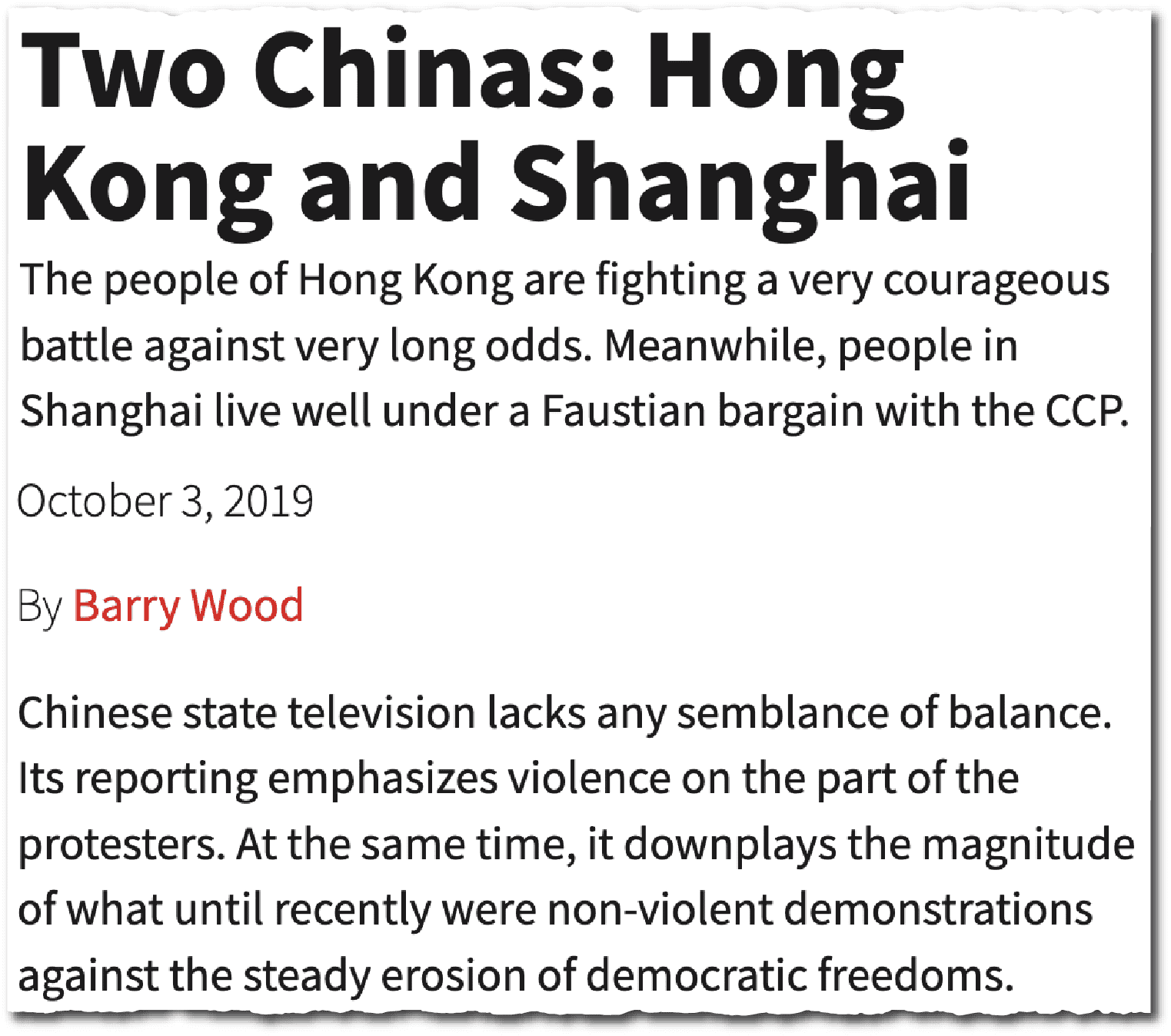 Barry D. Wood is a journalist, author and educator based in Washington, D.C. He was the international economics correspondent for RTHK radio in Hong Kong and also writes the American Dispatch column.