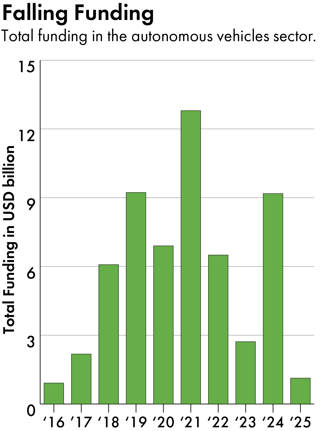 In 2021, the autonomous vehicle (AV) sector attracted $12.8 billion in venture capital funding — more money than AV start-ups received in the 30 months from January 2023 to June of this year.