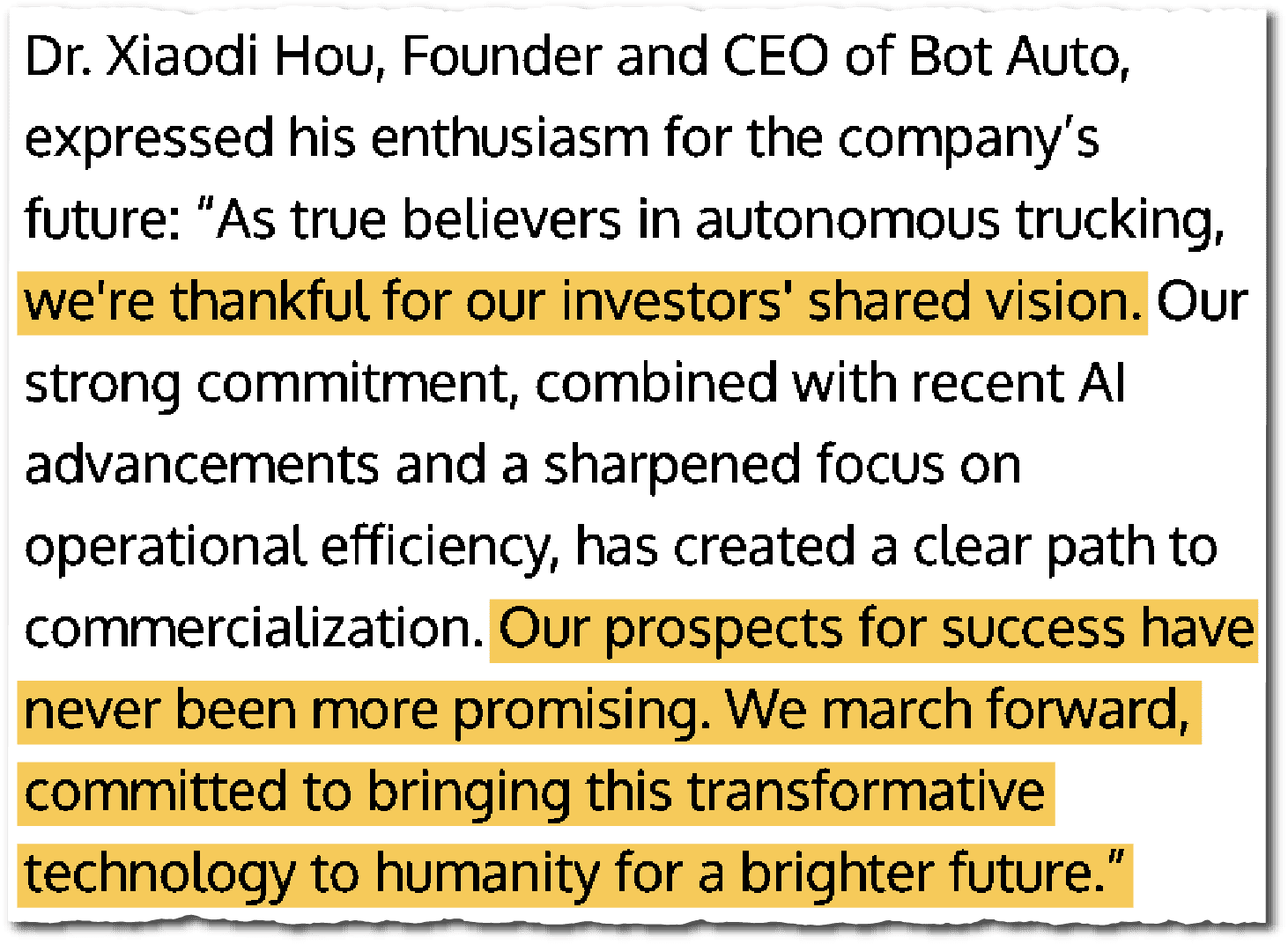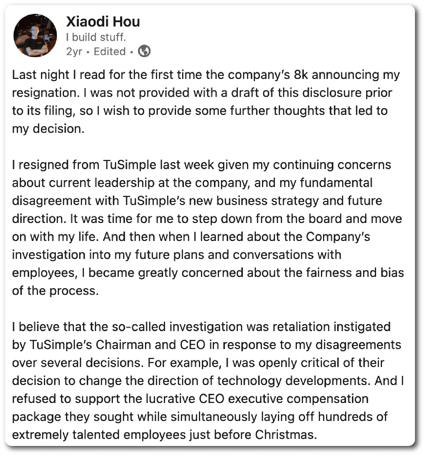 The TuSimple board fired Hou as CEO on October 30th 2022, citing an “ongoing investigation” into Hou’s interactions with Hydron. In a LinkedIn post, Hou denied any wrongdoing: “As the facts come to light, I am confident that my decisions as CEO and Chairman, and our vision for TuSimple, will be vindicated.”