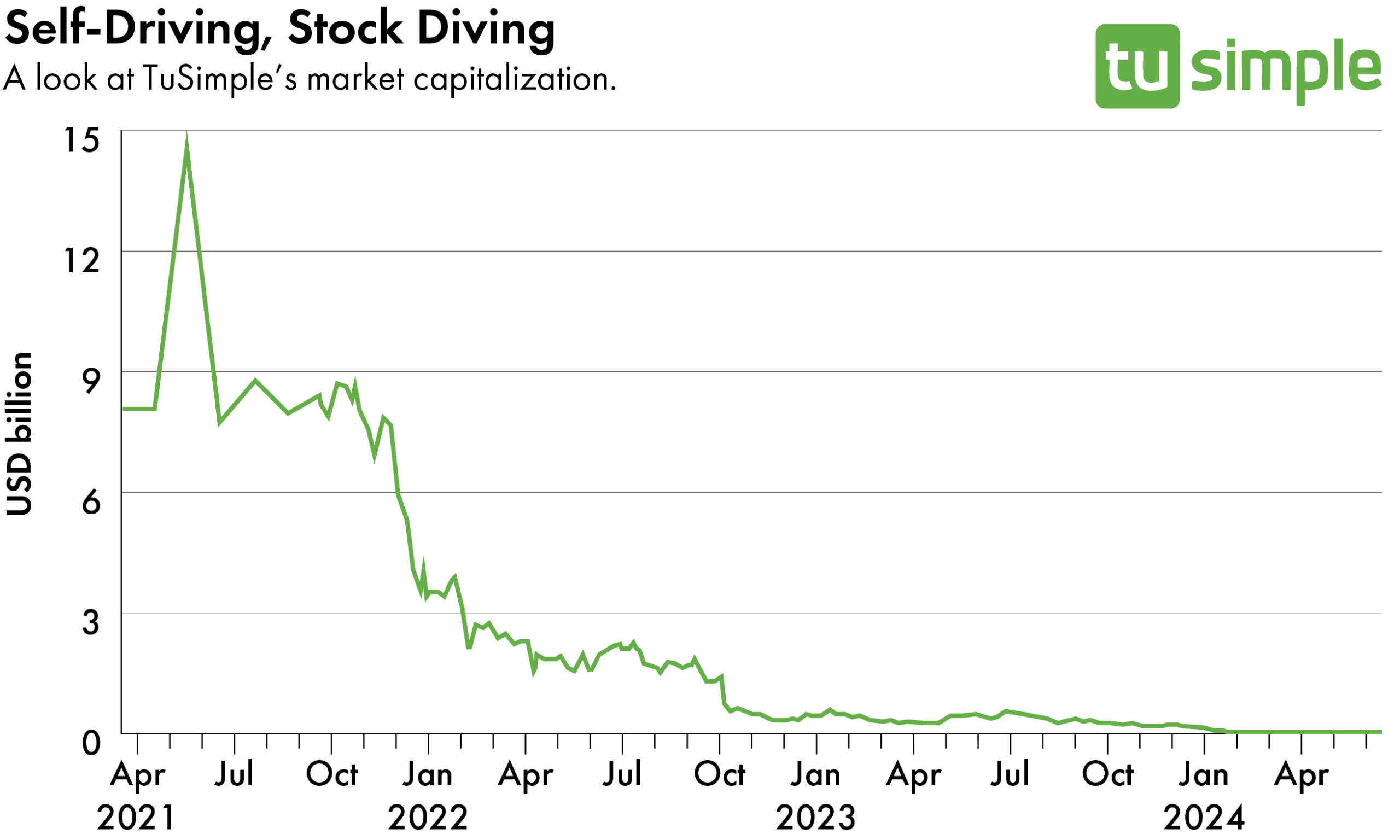 But TuSimple would fall even faster than its rose. In the year following its IPO, a high-profile accident involving one of its vehicles, multiple U.S. government national security investigations into its ties to China, and a bitter years-long dispute between Hou and other TuSimple executives left the company in shambles. Investors fled. By November 2022, just 19 months after its IPO, TuSimple’s market capitalization had fallen from a peak of $15 billion to below $500 million.