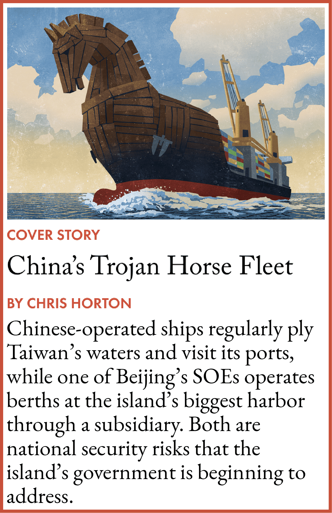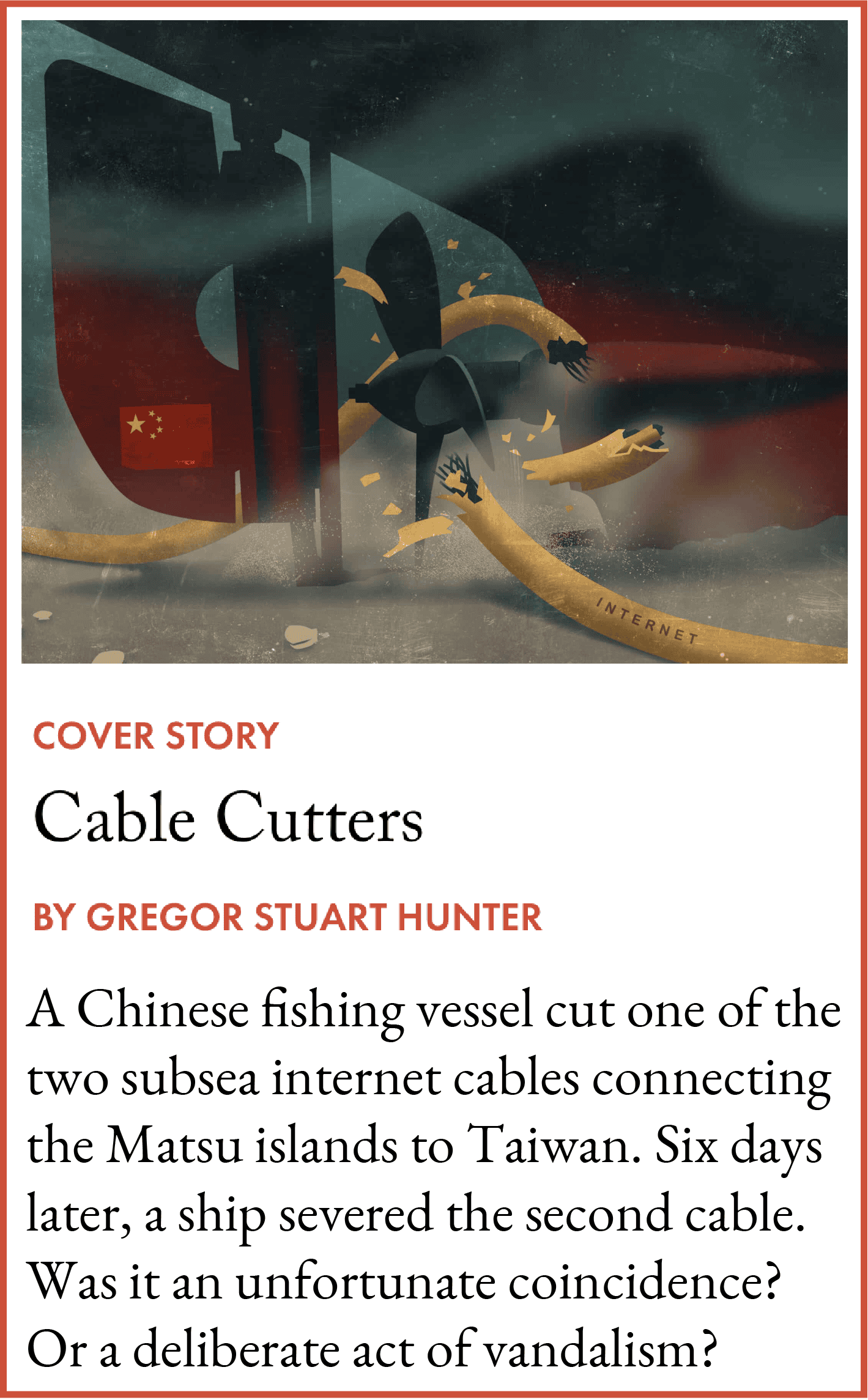 China-owned vessels have repeatedly damaged Taiwan’s undersea data cables in recent years, most recently in February. Turbine cables or other grid hardware along the west coast are also tempting targets.