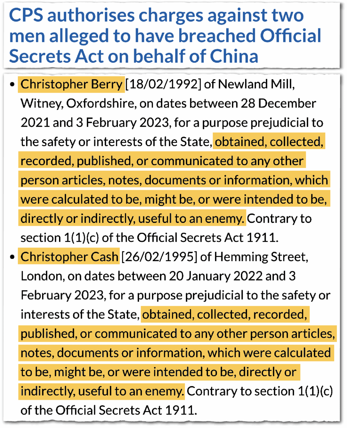 When the U.K.’s Crown Prosecution Service — the agency that brings criminal cases on behalf of the government — announced in April 2024 that it had arrested two British men for alleged acts of espionage with Chinese agents the news provoked intense media scrutiny at home and abroad. The formal indictment stated that Christopher Cash and Christopher Berry had been ‘charged with providing prejudicial information to a foreign state’.
