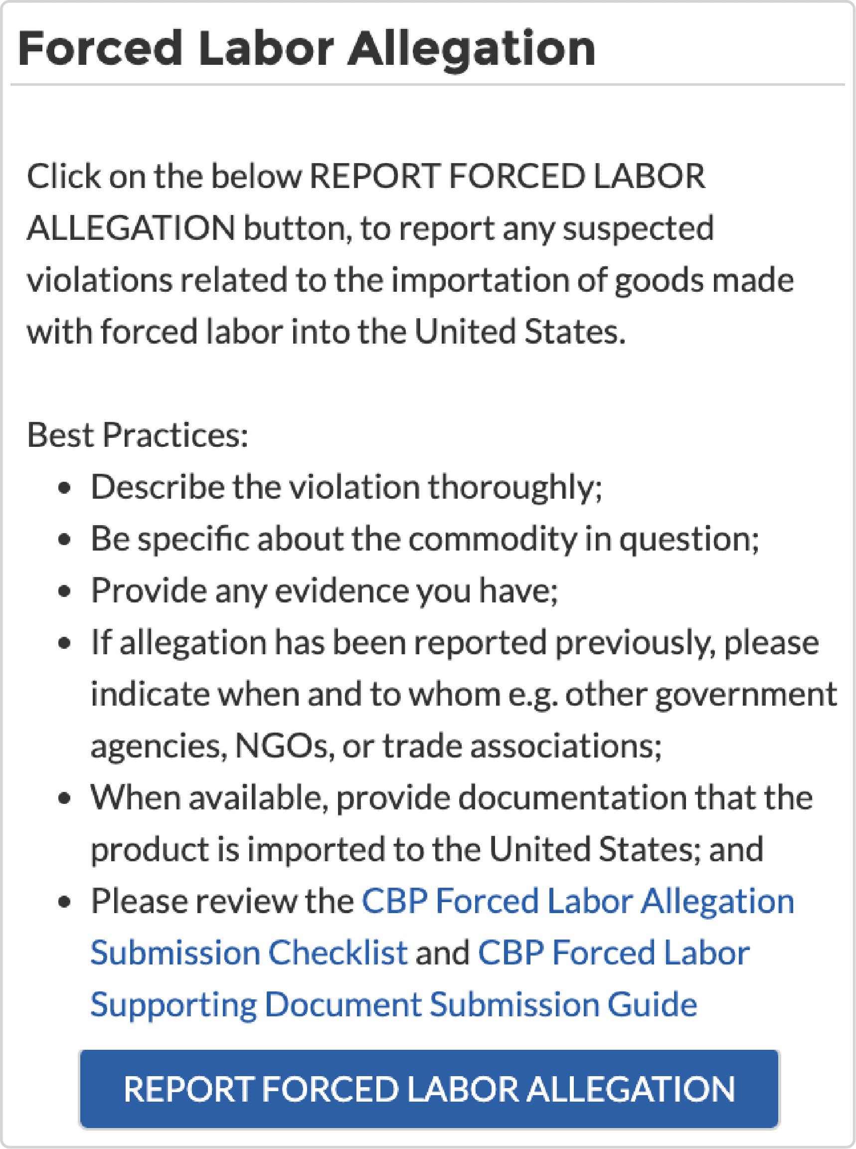 Yes, but not entirely. Customs and Border Protection (CBP) and the DHS-led Forced Labor Enforcement Task Force (FLETF) don’t consider it a secret that they are interested in the research nonprofit organizations and academic research institutions are putting out. They openly solicit allegations. The CBP has a portal where anyone can go in and say: I think this might be a product made with forced labor, whether in Xinjiang or elsewhere.