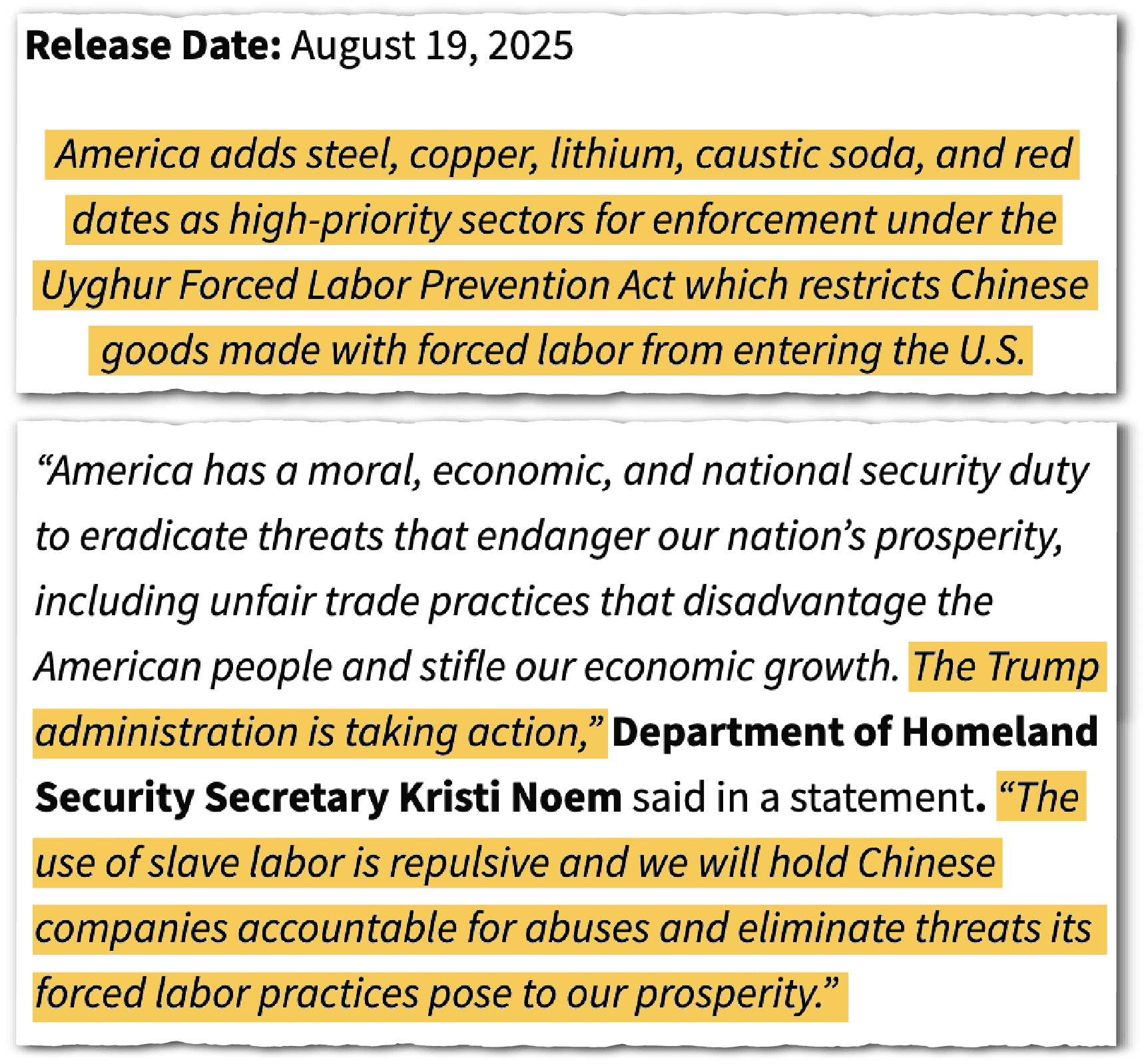 UFLPA Entity List entities “working with the government of Xinjiang to recruit, transport, transfer, harbor or receive forced labor or Uyghurs, Kazakhs, Kyrgyz, or members of other persecuted groups out of Xinjiang.” Credit: DHS