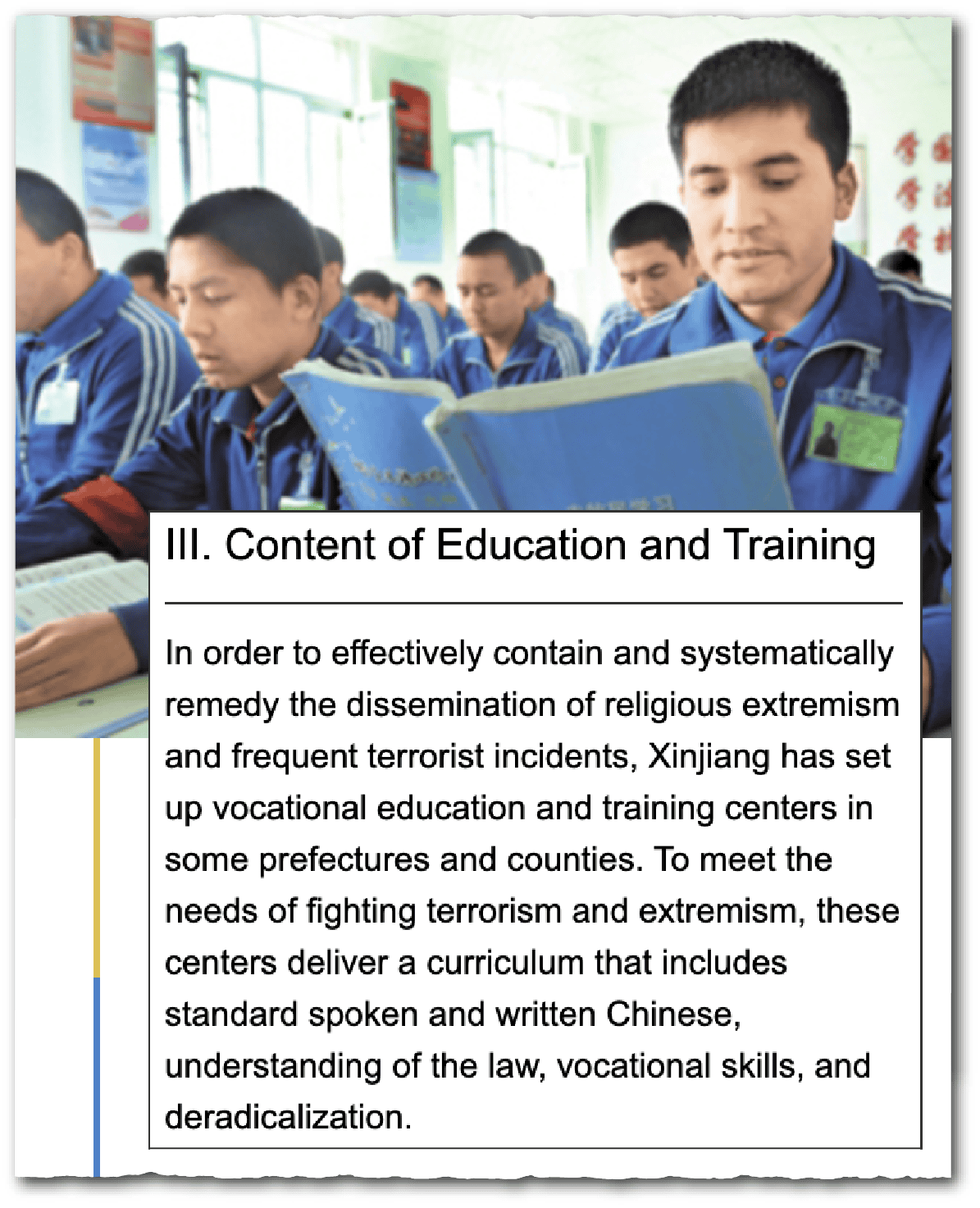 However, over 600,000 people have been put into another form of mass arbitrary detention that goes by the name of “prison.’ People have been moved through extrajudicial means, without a fair trial, for “crimes” that are not officially illegal, into prisons. I think it’s meant to have the sheen of legitimacy, because all countries in the world have prisons. China is able to say, look, you have mass incarceration in the U.S.. We have a little bit of mass incarceration over here in the Uyghur region. Who are you to critique that?