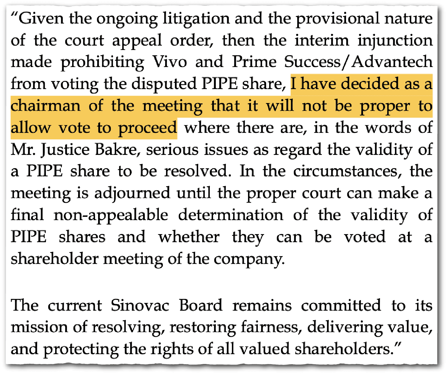 “The imposter board used the appeals court ruling to declare victory, despite the shares being ineligible from voting and the election results not being counted. Yet they filed with the SEC as if they had won and were in charge,” says Peter Halesworth. Halesworth, founder of Boston-based investing firm Heng Ren Partners, is a longtime independent Sinovac investor who supported the 1Globe-led board in the election contest in July.