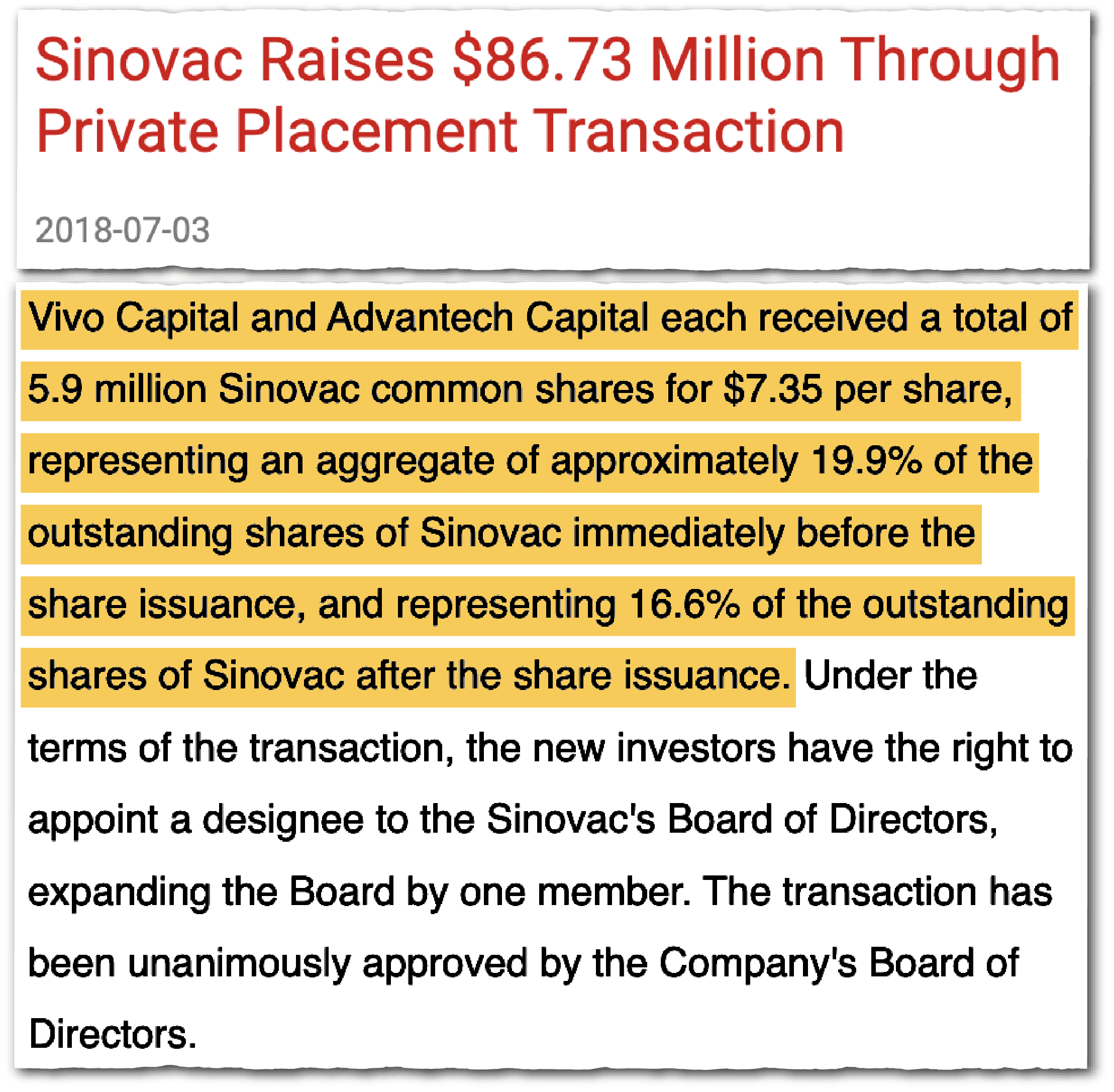 That July, Sinovac brought in two new investors whose stakes are now disputed: Vivo Capital, a Palo Alto-based private equity firm, and Advantech Capital, an investment firm spun out of New Horizon Capital.