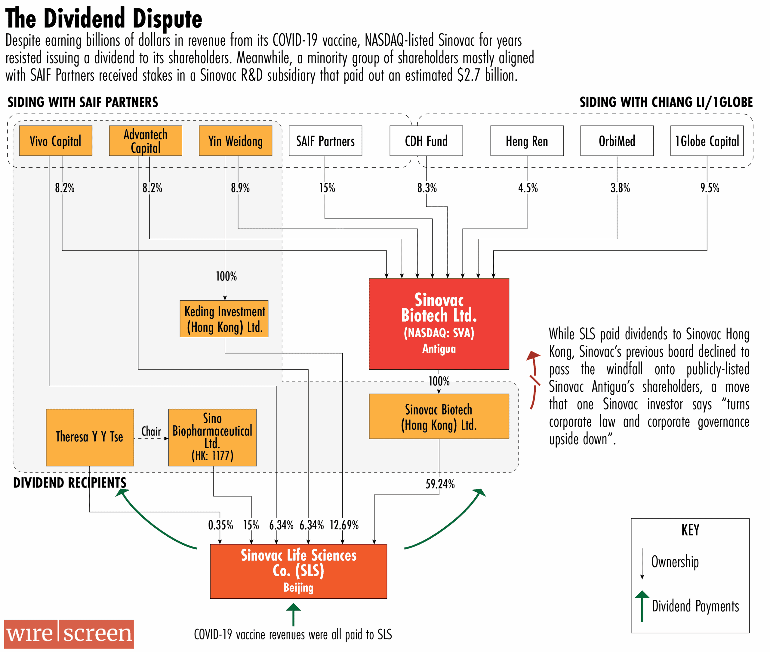Meanwhile, some of SLS’s shareholders benefitted. A group including Sino Biopharm, Vivo, Advantech, Yin and Tse received an estimated $2.7 billion in dividends between 2021 and the first half of 2024, according to records reviewed by The Wire. Investors in Nasdaq-listed Sinovac did not receive any corresponding dividends, despite their 59 percent share being worth an estimated $4 billion.
