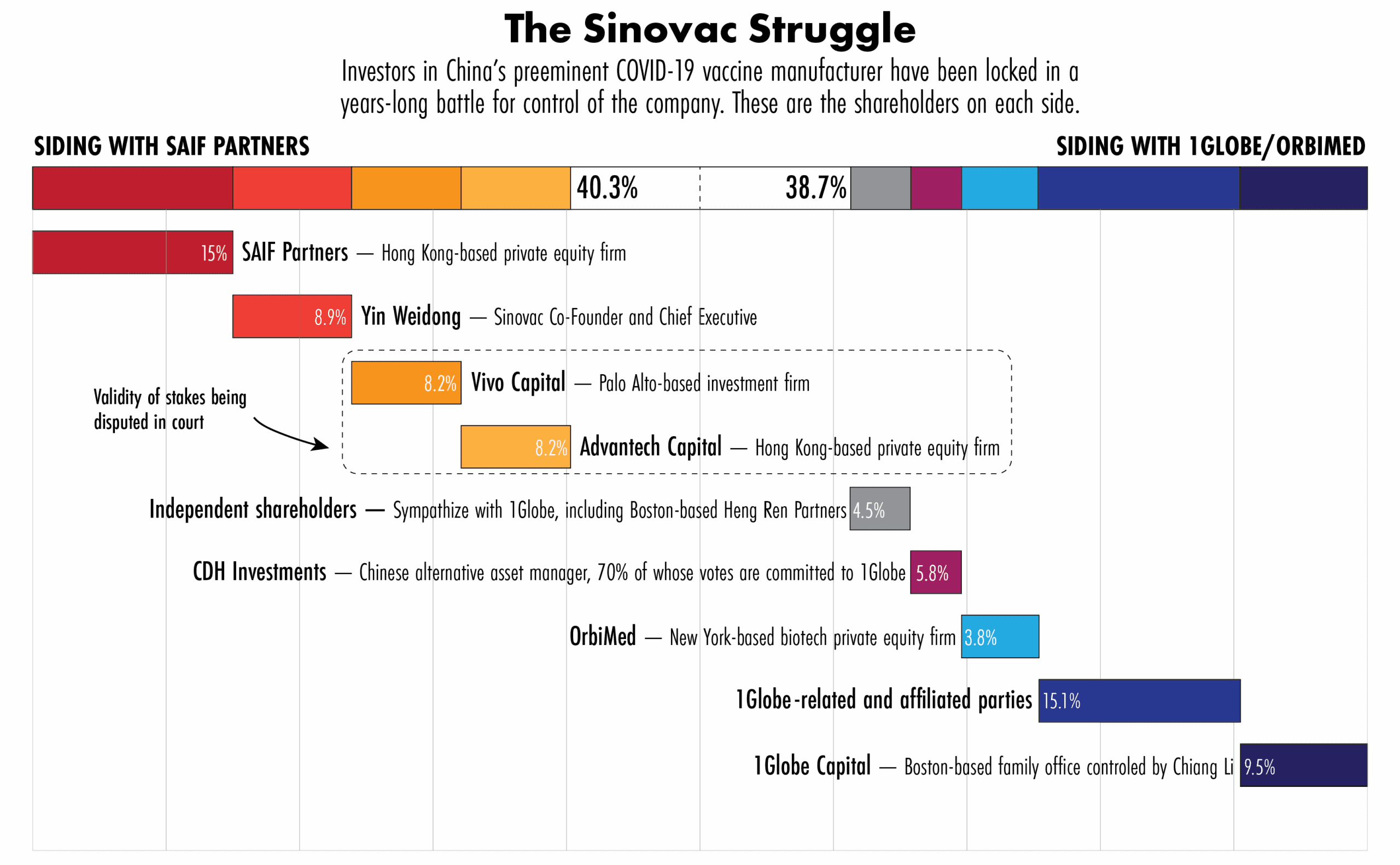 On one side was a group including Sinovac’s board chair, Jiaqiang Li, who goes by Chiang and holds his stake through 1Globe Capital. On the other was a rival group, led by Hong Kong private equity firm SAIF Partners, that also included Sinovac’s co-founder and chief executive, Yin Weidong.