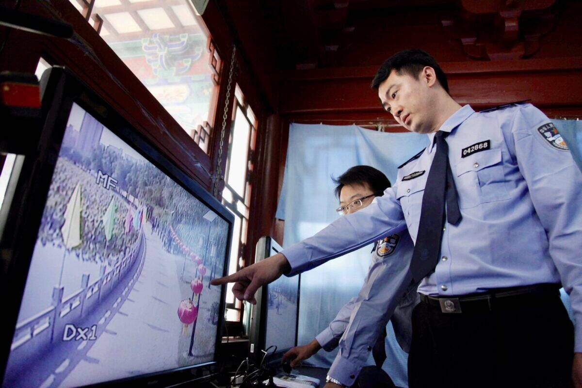 Left: Police officers monitor a screen displaying surveillance footage of a park in Beijing. Right: Surveillance cameras lined up on a beam over a road in Chenzhou, Hunan. Credit: ChinaImages via Depositphotos