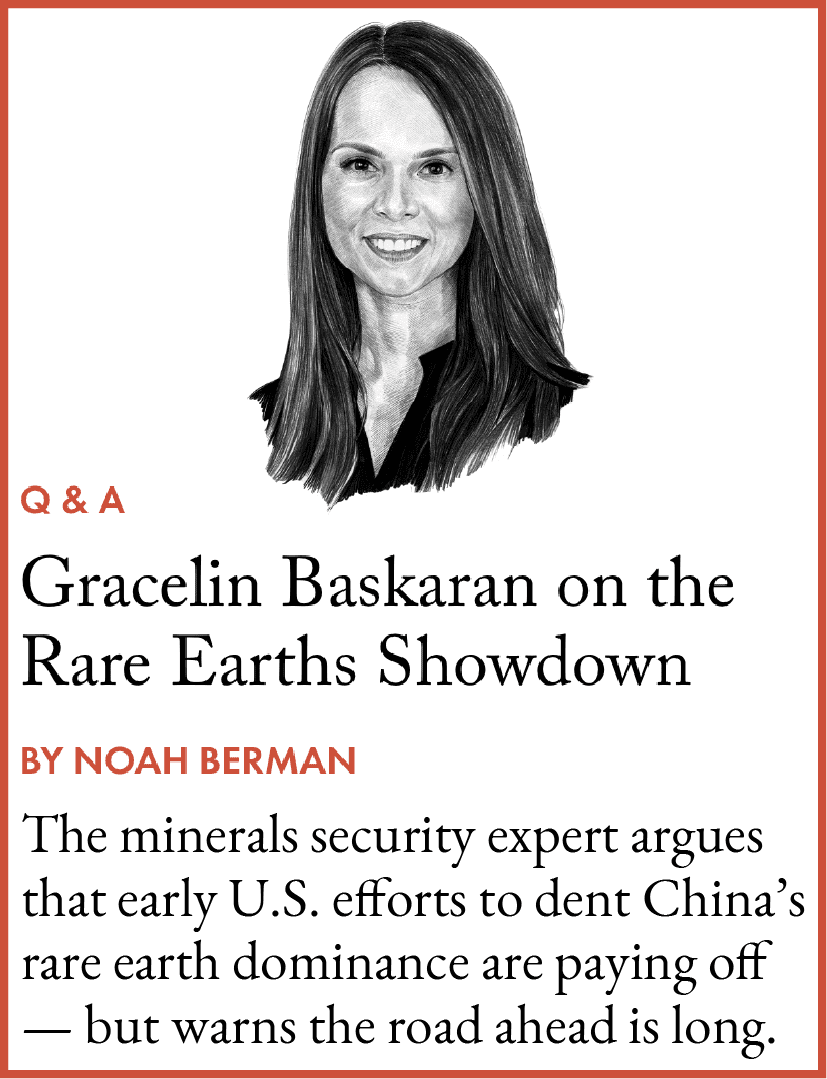 Meanwhile, the U.S. has pledged to use the pause in hostilities for an all-out effort to break China’s near-total control over rare earths. Treasury Secretary Scott Bessent has said that the U.S. is “going to do the equivalent of Operation Warp Speed to tackle [rare earth] processing,” referring to the pandemic-era partnership between the federal government and vaccine makers, and this month asserted that Beijing’s leverage in this area would last no more than 12 to 24 months.