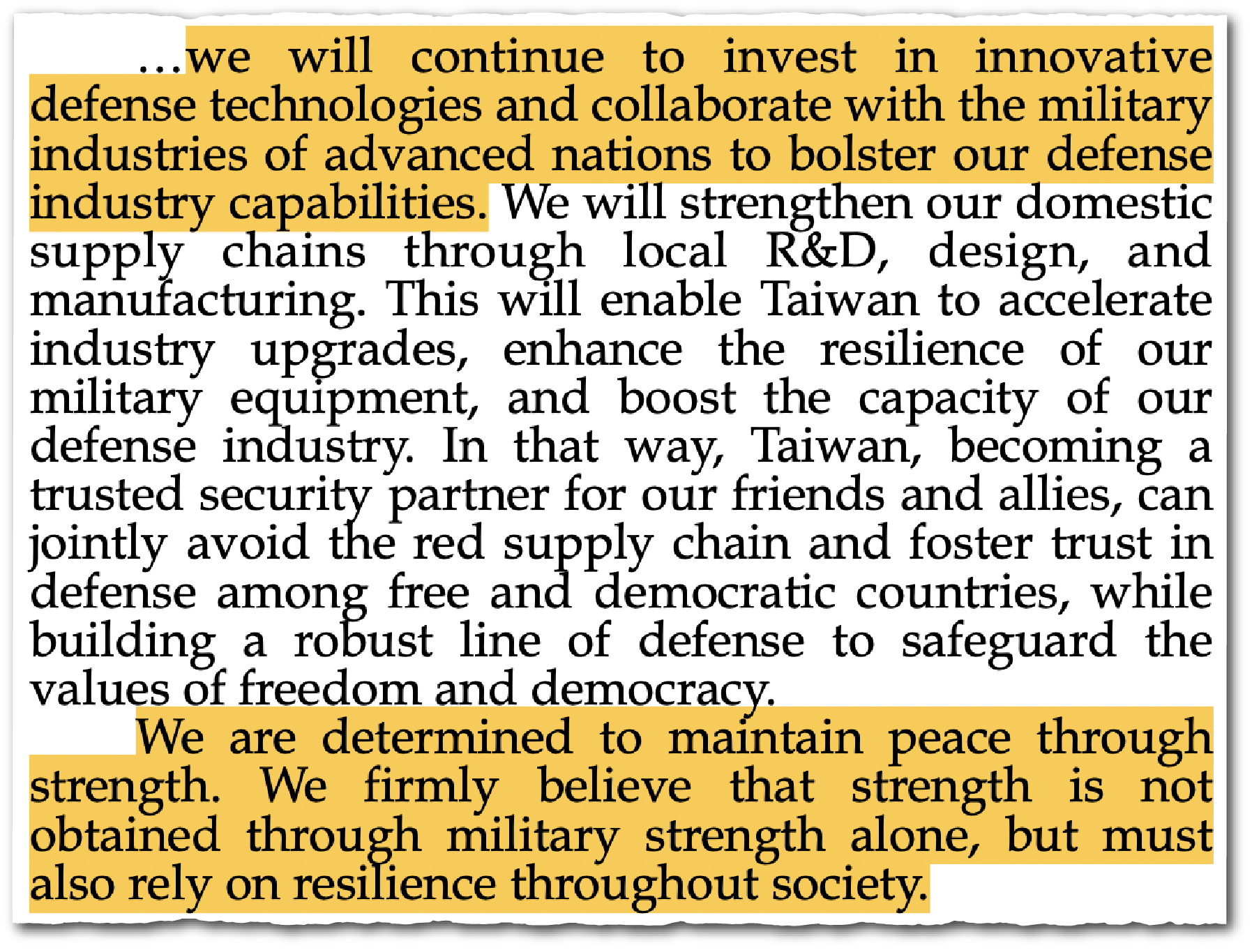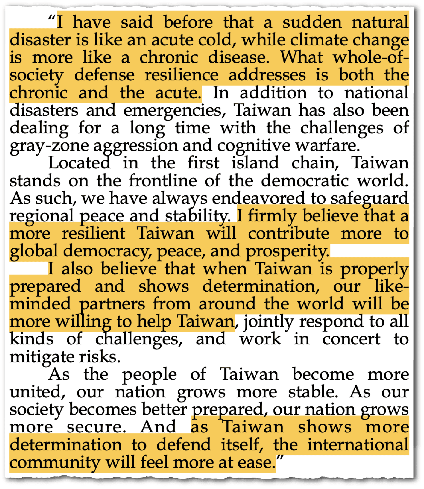 “Taiwan is absolutely determined to ensure its own national security,” he added. “I believe people help those who help themselves.”