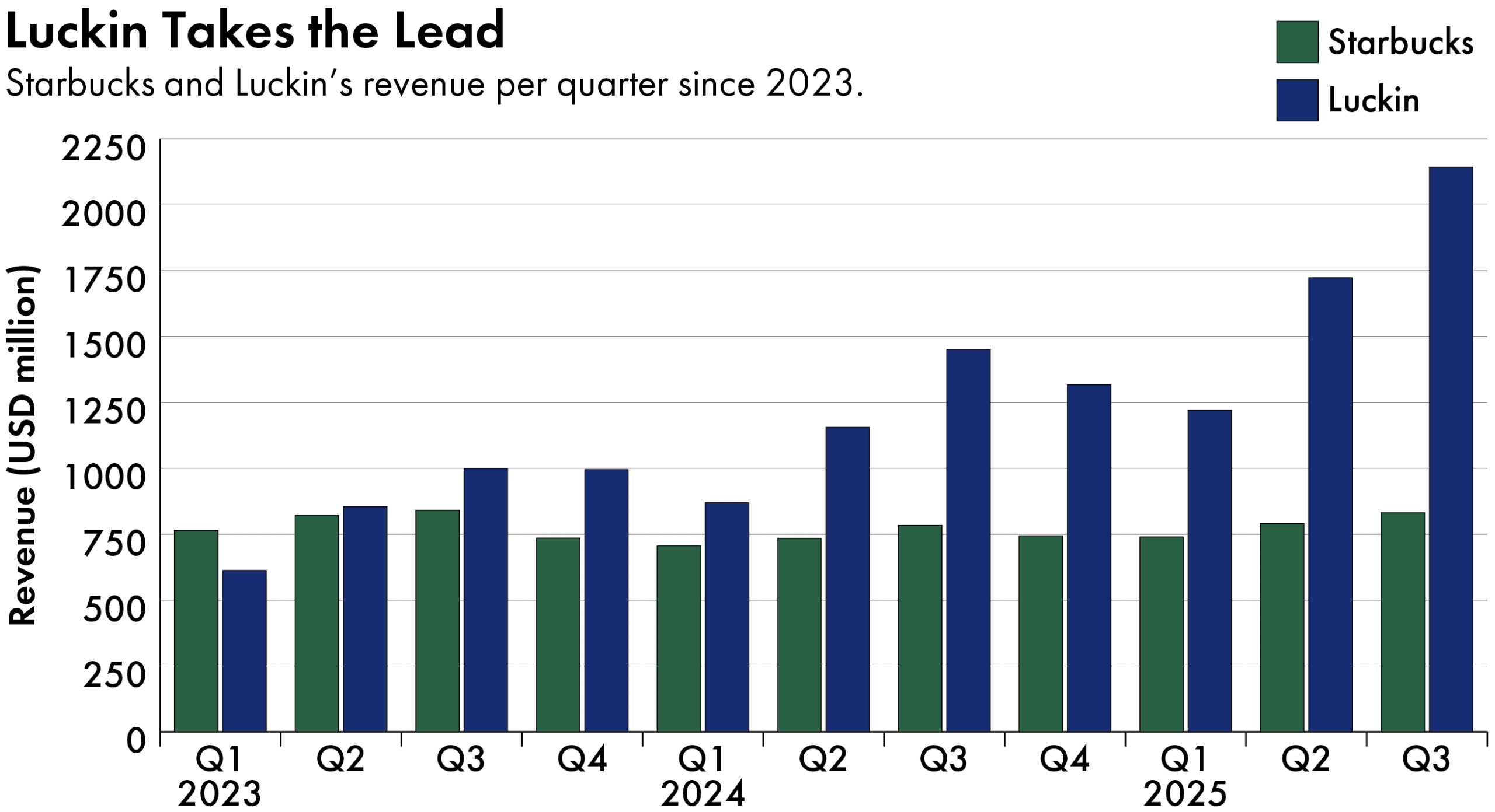 While Starbucks’ growth in the country has stagnated in recent years, Luckin, one of its main competitors, has expanded at the rate of one new store per hour this year. It recorded a 50 percent year-on-year jump in revenue in the latest quarter on the back of selling coffee with exotic flavors, such as a pineapple americano that typically costs around 15 yuan ($2.1).